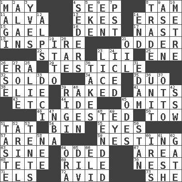 ACROSS 1. Fifth month 4. Ooze 8. Scottish cap 11. Inventor's middle name 13. Makes supply last 14. Celtic language 15. Highlander 16. Gouge 17. Political cartoonist Thomas 18. Heighten or intensify 21. More peculiar 22. Play the lead 23. Cards in a Roman deck? 25. Compass dir. 26. Period 29. One of the two male reproductive glands 32. Twentieth part of a lira 34. Adept person 35. Superhero pair 38. Writer Wiesel 39. Swept the length of 41. Pismires 43. And so on (abbr.) 44. Binary compound 45. Leaves out 46. Eaten 50. Pull behind 51. Make lace 54. Storage container 55. Snake ____ (dice throw) 57. Sports stadium 59. Nestling 63. Trig term 64. Wrote a lyric poem 67. Type of rug 68. Wig 69. Cause heat under the collar 70. A home for chicks 71. Raised railways 72. Enthusiastic 73. A female animal or person DOWN 1. Wise men 2. Actor Alda or Thicke 3. Jacques Cousteau's middle name 4. Spring feasts 5. Make supply last 6. Car or cant ending 7. Pacific Standard Time (abbr.) 8. Swap 9. NE Netherlands city 10. Distance measurement (Brit.) 12. High mountains 14. Conclude 19. "Tell ____ the Marines!" 20. Actress Charlotte 21. Lubricate 23. Louse (plural) 24. On the rocks 26. Compass dir. 27. Hero or heavy, e.g. 28. Set down 30. Receives possession of 31. Dutch treat 33. Tenth: prefix 36. A single undivided whole 37. Von Bismarck 39. Swiss mountan, "Queen of the Mountains" 40. An important port of Yemen 42. Compass dir. 45. Lyric poems 47. Basketball assoc. 48. Looked after 49. Sight organ 51. Clothes sense 52. Satellite of Uranus 53. Portable shelters 56. Comedian Laurel of Laurel & Hardy 58. Born 60. Angers 61. Soft 62. Yard entry 64. Mouth or opening 65. HTML Container Element 66. Biblical high priest