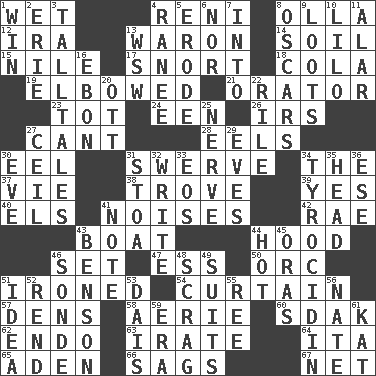 ACROSS 1. Soggy 4. Painter Guido (1575-1642) 8. Water jar 12. Retirement account (abbr.) 13. Make _____ (do battle with) 14. The visible part of the earth's surface 15. Mediterranean tributary 17. Derisive sound 18. Root beer relative 19. Turned at an angle; bent 21. Speaker 23. Small child 24. Car or cant ending 26. Big collection agency 27. Patter 28. Snakelike fish 30. Snakelike fish 31. Turn aside suddenly 34. Definite Article 37. Compete 38. Collection of objects 39. It is so 40. Raised railways 41. Annoying sounds 42. Actress Charlotte 43. Water vessel 44. Parka part 46. Arrange properly for use 47. Double-curved letter 50. The grampus (Milton) 51. Pressed 54. Window treatment 57. Cub Scout units 58. Nest on high 60. Neighbor of Neb. 62. Inside; within (prefix) 63. Feeling or showing extreme anger 64. Call ___ day 65. An important port of Yemen 66. Sinks 67. Remaining after all deductions DOWN 1. Victory 2. 4th largest of the Great Lakes 3. Baron Munchausen's specialties 4. Indian princess (variant) 5. Eat (away) 6. And not 7. To the inside or interior of 8. Motion picture awards 9. Plunders 10. _ and Stitch 11. Having or resembling wings 13. Compass dir. 16. Inky black, to poets 20. Baseball player Mel 22. Cause heat under the collar 25. Impudent aggressiveness 27. To provide with a ceiling 29. Nights before holidays 30. Night before a holiday 31. Portico 32. Compose 33. Greek goddess of the dawn 34. Polypeptide antibiotic 35. Froth on beer 36. Compass dir. 41. Musical sound 43. Gillaume's butler role 44. Being at a high temperature 45. Mouths or openings 46. Something which is sent 48. Lean end of the neck 49. Sets of matching outer garments 51. It may be bright or harebrained 52. Tear apart 53. Raised platform 55. To sift 56. Nathan's nickname 59. Epoch 61. Krazy ___ of comics