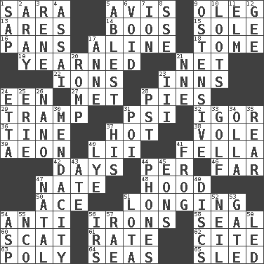 ACROSS 1. "Two Mules for Sister ____" 5. Advice 9. Cassini of fashion 13. Ancient Greek god of war 14. Expressions of contempt or scorn 15. Not divided or shared with others 16. Baking dishes 17. Place in a line 18. Heavy book 19. Had a strong desire 21. Remaining after all deductions 22. Charged atoms 23. Restaurants 24. Car or cant ending 27. Was introduced to 28. Sliced desserts 29. _____ steamer (cargo ship) 31. 23rd letter of the Greek alphabet 32. Composer Stravinsky 36. Prong on a fork 37. Being at a high temperature 38. Short-tailed, large-bodied rat 39. Period of immesurable duration 40. Cards in a Roman deck? 41. Man or boy (slang) 42. 24-hour periods 44. For each 46. Distant 47. Nathan's nickname 48. Parka part 50. Adept person 51. Yearning 54. Opposed to 56. Metal shackles 58. Lick closed 60. Get outta here! 61. Assign a rank or rating to 62. Quote 63. More than one (prefix) 64. Oceans 65. Downhill vehicle DOWN 1. Plant excrement 2. Like ___ of sunshine 3. French philosopher Descartes 4. Slender Brazilian palm 5. Most capable 6. Null 7. Electrically charged atom 8. Compass dir. 9. Clearly or manifestly demonstrative 10. Plunders 11. Shade tree 12. Unit of force equal to gravity 17. Singer Murray 20. Play 21. Compass dir. 23. One more than two 24. Singer James 25. One of the Great Lakes 26. Billionth: prefix 28. Pacific Standard Time (abbr.) 30. Ananias' fault 31. Luau course 33. _ course 34. Water jar 35. Stern 37. Part of HMS, perhaps 40. Potassium hydroxide 41. Tree-dwelling hopper 43. Had dinner 44. Gives a jingle 45. Immeasurably long periods of time 47. Relating to or accompanying birth 49. Plates 51. Globular water bottle used in Asia 52. Famous astronaut Armstrong 53. Yard entry 54. Cleo's killer 55. Non-commissioned officer (abbr.) 56. Big collection agency 57. Actress Charlotte 59. Directed