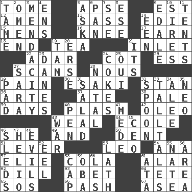 ACROSS 1. Heavy book 5. Domed church section 9. Eastern Standard Time (abbr.) 12. So be it 13. Backtalk 14. Singer Brickell 15. Not women's 16. Leg joint 17. Merit 18. Conclusion 19. Afternoon social gathering 21. An arm off of a larger body of water 22. The sixth month of the Jewish calendar 24. Small bed 26. Double-curved letter 27. Fraudulent business schemes 28. Common sense 29. Ache 30. 1973 Nobel Price Winner (Physics) Leo 32. Comedian Laurel of Laurel & Hardy 36. Johnson of "Laugh-In" 37. Had dinner 38. Light colored 39. 24-hour periods 40. Suffix with ecto or cyto 42. Butter sub 43. Welt 44. Learning spot: Fr. 46. A female animal or person 49. Plus 50. Undesirable depression on a surface 51. Prying instrument 53. Lion 54. Santa ___, CA 57. Writer Wiesel 58. Root beer relative 61. Having or resembling wings 62. Deli pickle 63. Collude with 64. Wig 65. Distress signal 66. Romantic infatuation 67. Toward the sea DOWN 1. Docile 2. Sign of something about to happen 3. Ananias' fault 4. Followers of ems 5. "____ silly question..." 6. Baking dish 7. Compass dir. 8. Compass dir. 9. Peak District village in England 10. Titles for men of rank and authority 11. Portable shelters 14. Car or cant ending 19. Scottish cap 20. Celtic language 21. ___ a Wonderful Life 23. Natives or inhabitants of Denmark 24. Popular sodas 25. Fr. "Yes" 27. "Two Mules for Sister ____" 28. Brizilian seaport 29. Groovy apt. 31. Vegetable dish 32. Soup utensil 33. Baron Munchausen's specialties 34. Toward shelter 35. Modern: prefix 40. Fenced enclosure 41. Ancient Persian 43. Armed conflict 45. Corporate head (abbr.) 46. Bobsleighs 47. Sun: prefix 48. Vices 52. Snakelike fish 53. Thin strip of wood or metal 55. Nathan's nickname 56. Length times width 58. Head covering 59. Chief or king in Benin or Nigeria 60. French article 61. "One Day ___ Time"