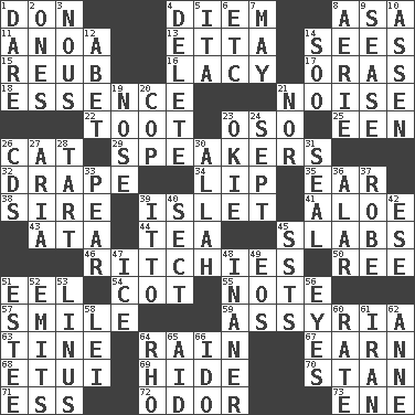 ACROSS 1. Spanish title 4. South Vietnam president (1954) 8. White ___ sheet 11. Small Philippine buffalo 13. Singer James 14. Perceives with the eye 15. Reuben's nickname 16. Made of lace 17. Mouths or openings 18. Center 21. Annoying sound 22. A blast of a horn 23. Bear (Spanish) 25. Car or cant ending 26. Feline 29. Orators 32. Window treatment 34. Mouth edge 35. Hearing organ 38. Father 39. Small island 41. _ vera 43. _ moment's notice (2 wds.) 44. Afternoon social gathering 45. Thick slices 46. Actors Guy, Robert Welles, and Clint 50. To riddle 51. Snakelike fish 54. Small bed 55. Musical sound 57. Grin 59. Nineveh was its capital 63. Prong on a fork 64. Precipitation 67. Merit 68. Needle holder 69. Flintstone garb 70. Comedian Laurel of Laurel & Hardy 71. Double-curved letter 72. Scent 73. Compass dir. DOWN 1. Have the gumption 2. Washington bills 3. Common sense 4. Erase 5. Call ___ day 6. And so on (abbr.) 7. Can I? 8. Nest on high 9. Gospel singer Marvin 10. NE Netherlands city 12. Collude with 14. "Barney Miller" actor Jack 19. Characteristic smell of wine 20. Police officer (slang) 21. And not 23. Migrant worker of the '30s 24. Back-to-school mo. 26. Music discs 27. Operatic vocal solo 28. Small pie 30. Assad's deity 31. Lick closed 33. Lightbulb-shaped fruit 36. Having or resembling wings 37. Loose flowing garment 39. "Tell ____ the Marines!" 40. Religious group 42. Compass dir. 45. Fast planes 47. Frozen water 48. More lacking in sense or substance 49. Greek goddess of the dawn 51. First name in cosmetics 52. Sends forth 53. "_ and Lucy" (Charlie Brown theme song) 56. Sight organs 58. Flowery wreath 60. Pace 61. SW Asia republic 62. Queen of England 1702-14 64. 17th letter of the Greek alphabet 65. Assist 66. Wedding promise