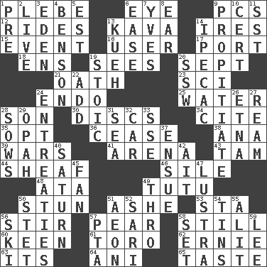 ACROSS 1. Cadet 6. Sight organ 9. Personal Computers (abbr.) 12. Amusement-park features 13. Polynesian shrub of the pepper family 14. Angers 15. Happening 16. One who makes use of a thing 17. Left side of a ship or aircraft 18. Followers of ems 19. Observes 20. Back-to-school mo. 21. Pledge 23. _-fi 24. Inside; within (prefix) 25. Wetness 28. Boy, to dad 30. Flat circles 34. Quote 35. Choose 36. Desist 38. Santa ___, CA 39. Armed conflicts 41. Sports stadium 43. Scottish cap 44. Bundle of cut stalks of grain 46. Filth; sediment 48. "One Day ___ Time" 49. Ballerina skirt 50. Surprise greatly 51. American tennis player Robert 53. R.R. building 56. Use a spoon 57. Lightbulb-shaped fruit 58. Not moving 60. Peachy ____! 61. "Corrida" creature 62. Bert's buddy 63. ___ a Wonderful Life 64. Cuckoo 65. Clothes sense DOWN 1. Before (prefix) 2. Not recorded 3. Genesis locale 4. Gillaume's butler role 5. Eastern Standard Time (abbr.) 6. Relaxation 7. Jacques Cousteau's middle name 8. Ewer handle 9. Conciliate 10. Certainty 11. Fast jet (abbr.) 13. Malaysian steamed pastry 14. Medicinal drug used to evoke vomiting 19. Unemotional 20. Compass dir. 22. Find the sum of 24. Pleas 26. Inactive volcano in Sicily 27. 480, 500 or 516 sheets of paper 28. Sty mamas 29. Brightly colored fish 31. Ocean 32. 4-wheeled motor vehicle 33. Compass dir. 37. Take place subsequently 40. Titan orbits this 42. Small island 45. Avid follower 47. A period of five years 49. Through, poetically 50. Proofreading order 51. A really long time 52. Indian skirt 54. Canisters 55. Set down 56. What Jean-Claude Killy likes to do 57. Parent Teacher Assoc. 58. Put into a specified state 59. Area sheltered from the wind