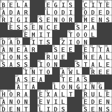 ACROSS 1. Actor Lugosi 5. Armor plate that protects the chest 9. Quote 13. The sixth month of the Jewish calendar 14. Farming town in central California 15. Wrote a lyric poem 16. Swiss mountan, "Queen of the Mountains" 17. Sir (Sp.) 18. Not women's 19. Substance 21. Health resort 22. Send forth 23. Implement 24. Male parent 27. It is 28. The Jewish people; Israel 29. Approach 31. Perceive with the eye 32. Singer James 36. Charged particles 37. Sorrow 38. Actress Patricia 39. Backtalk 40. Electrically charged atom 41. Showing deterioration from age 42. To the inside or interior of 44. Leather borer 46. Portuguese money of account (variant) 47. Toward the sea 48. Afternoon social gatherings 50. _ moment's notice (2 wds.) 51. Yearning 54. Israeli folk dance 56. Glorify 58. Court order 60. Soon (poet.) 61. Morally bad or wrong 62. Paradise 63. Undesirable depression on a surface 64. Hats (slang) 65. Elected reps. DOWN 1. Long, evenly shaped piece 2. Singer Brickell 3. Fails to keep up a pace 4. Originate 5. Opts 6. Went 7. Wedding promise 8. Title for a knight 9. Part 10. Standard of perfection 11. Nine, plus one 12. Begley and Asner 17. In a ____ (agitated or irritated) 20. Arab leader 21. "Barney Miller" actor Jack 23. Neckwear 24. Raised platform 25. Small Philippine buffalo 26. Habitations of wild animals 28. Last letter of the English alphabet 30. Aide 31. Player for Phoenix 33. Lacerate 34. Falsehood 35. Toward shelter 37. Friend of Pooh 40. Call ___ day 41. Volcanic refuse 43. Teachers' org. 44. Ringlike coral islands and reefs 45. Gone 47. Composer Copland 49. Begets 51. Put down 52. Unadorned 53. Small, secluded valley 54. Possessed 55. Single 56. Snakelike fish 57. 16 59. Followers of ems