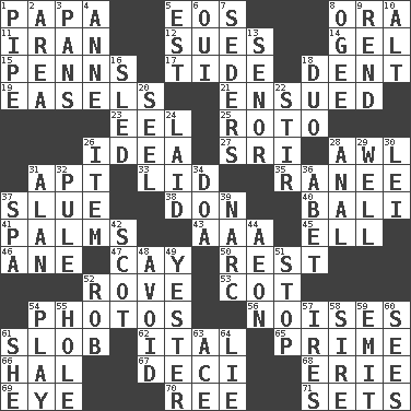 ACROSS 1. Dad 5. Greek goddess of the dawn 8. Mouth or opening 11. SW Asia republic 12. Takes to court 14. Set 15. Actor Sean's family 17. Periodic rise and fall of the sea level 18. Gouge 19. Artist's stands 21. Took place subsequently 23. Snakelike fish 25. Printing process, for short 26. The content of cognition 27. _ Lanka 28. Leather borer 31. Fitting 33. Flaplike covering 35. Indian princess (variant) 37. Turn sharply 38. Spanish title 40. Indonesian resort city 41. Insides of hands 43. American Automobile Association (abbr.) 45. Pipe bend 46. A saturated hydrocarbon 47. Island 50. Respite 52. Be footloose 53. Small bed 54. Pictures 56. Annoying sounds 61. Messy guy 62. Slanted text style (abbr.) 65. First class 66. Actor Linden 67. Tenth: prefix 68. 4th largest of the Great Lakes 69. Sight organ 70. To riddle 71. Arranges properly for use DOWN 1. Corncob 2. Type of rug 3. Zero-star reviews 4. Queen of England 1702-14 5. Eastern Standard Time (abbr.) 6. Fr. "Yes" 7. Spring feasts 8. Double curve, resembling the letter S 9. Tear apart 10. The first octave above the treble staff 13. Sir (Sp.) 16. Downhill vehicle 18. Superhero pair 20. Stitch closed the eyes of (a falcon) 22. Use a swizzle stick 24. Put down 26. Detail 28. Of or related to the anus 29. Water source 30. Luau accessory 31. Actor Alda or Thicke 32. Whimper 34. ___ good deed 36. Collude with 37. Health resort 39. Drug cop 42. Highlander 44. A really long time 48. Shun 49. Last past 51. Cease 52. Director Reiner 54. Live dramatic performance 55. Hollow 57. Angers 58. Male parent of an animal 59. Send forth 60. Observes 61. A female animal or person 63. Adept person 64. Falsehood