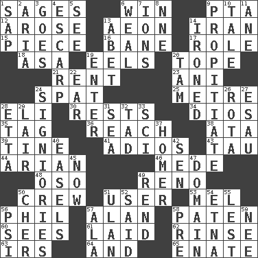 ACROSS 1. Gurus 6. Victory 9. Parent Teacher Assoc. 12. Came up 13. Period of immesurable duration 14. SW Asia republic 15. Part 16. Object of repulsion 17. Hero or heavy, e.g. 18. White ___ sheet 19. Snakelike fish 20. Drink excessively 21. Monthly bill 23. Black tropical American cuckoo 24. Petty quarrel 25. Distance measurement (Brit.) 28. Biblical high priest 30. Musical pauses 34. "Vaya con ____" 35. Label 36. Arrive at 38. "One Day ___ Time" 39. Prong on a fork 41. Goodbye (Sp.) 43. The 19th letter of the Greek alphabet 44. Believer in; advocate of (suffix) 46. Ancient Persian 48. Bear (Spanish) 49. Former U.S. Attorney General Janet 50. Ship's personnel 51. One who makes use of a thing 53. Cartoonist voice _ Blanc 56. Silvers or Donahue 57. Actor Alda or Thicke 58. Eucharist need 60. Perceives with the eye 61. Put down 62. Wash lightly 63. Big collection agency 64. Added to 65. Related on the mother's side DOWN 1. Plant excrement 2. Operatic vocal solo 3. Moves 4. Fortification 5. Perceive with the eye 6. Welt 7. Charged particles 8. Compass dir. 9. Conciliate 10. Falsehood 11. One (Scot) 13. Collude with 14. Pressed 19. Keyboard key 20. Scottish cap 22. Ewer handle 24. Seigniories (variant) 26. Round or rotation of duties 27. He sold his birthright 28. Singer James 29. Den 31. Ocean 32. Small boy 33. _-fi 37. Simpsons dad 40. Artist's stands 42. Elected rep. 45. At this time 47. Kingdom 49. Tear apart 50. "Mermaids" star 51. ____ Bator, Mongolia 52. Expressed in words 54. Inactive volcano in Sicily 55. For fear that 56. Air pressure measure (abbr.) 57. Chicken ___ king 58. Before (prefix) 59. Born
