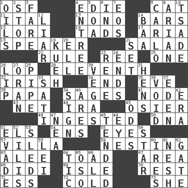 ACROSS 1. Order of Saint Francis (abbr.) 4. Singer Brickell 8. Domesticated feline 11. Slanted text style (abbr.) 13. Words to Nanette 14. Soap units 15. Australian parrot (variant) 16. Small amounts or degrees 17. Operatic vocal solo 18. Orator 21. First course 22. Governing power 23. To separate or throw off 25. Single 26. Chop off 29. Veterans Day date 32. From or relating to Ireland 34. Conclude 35. Night before a holiday 38. Dad 39. Gurus 41. Thickened enlargement 43. Fish or hair follower 44. Retirement account (abbr.) 45. Flexible twig of a willow tree 46. Swallowed 50. Heredity factor (abbr.) 51. Raised railways 54. Followers of ems 55. Snake ____ (dice throw) 57. Country estate 59. Inhabiting a nest 63. Toward shelter 64. Frog relative 67. Type of rug 68. "You Light Up My Life" star Conn 69. Small island 70. Respite 71. Double-curved letter 72. Chilled 73. A female animal or person DOWN 1. Lubricates 2. Close up, plug up 3. Conductor's collection 4. Main course 5. ___ good deed 6. Working for oneself (abbr.) 7. Greek goddess of the dawn 8. Monte _, Las Vegas Hotel/Casino 9. Believer in; advocate of (suffix) 10. Sadhe (variant) 12. One who doesn't tell the truth 14. Sound made by sheep 19. Malaysian steamed pastry 20. Pipe bend 21. Arrange properly for use 23. French philosopher Descartes 24. Conclusions 26. Mouth edge 27. NW Algerian seaport 28. Corncob 30. Viva Las _ 31. Coop moms 33. Suttee (variant) 36. Lacking any legal or binding force 37. Genesis locale 39. Public display of a written message 40. Ancient Greek god of war 42. Period 45. Lyric poems 47. Teachers' org. 48. Watched over 49. Sight organ 51. Dodge 52. Ms. Damita and namesakes 53. Bobsleighs 56. Play the lead 58. Luau accessory 60. Angers 61. Tender 62. Yard entry 64. Nervous spasm 65. Bear (Spanish) 66. 100%