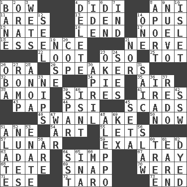 ACROSS 1. Arrow shooter 4. "You Light Up My Life" star Conn 8. Black tropical American cuckoo 11. Ancient Greek god of war 13. Locale of original sin 14. Musical composition 15. Nathan's nickname 16. Grant temporary use of 17. Christmas carol 18. Gist 21. Effrontery 22. Plunder 23. Bear (Spanish) 25. Small child 26. Mouth or opening 29. Orators 32. Maid-servant 34. Sliced dessert 35. Atmosphere 38. Mine, in Marseilles 39. Male parents of animals 41. Angers 43. Infant food 44. Air pressure measure (abbr.) 45. Heaps 46. Tchaikovsky ballet 50. Immediately 51. A saturated hydrocarbon 54. Tate display 55. Allows 57. Type of eclipse 59. Honored 63. The sixth month of the Jewish calendar 64. Simple or foolish person 67. Like ___ of sunshine 68. False hair 69. Fastener 70. We are 71. Compass dir. 72. Pacific island yam 73. Conclusion DOWN 1. Object of repulsion 2. Mouths or openings 3. Moistens 4. Keyboard key 5. Binary compound 6. Lair 7. Working for oneself (abbr.) 8. To the left, to Queeg 9. New (sp.) 10. Small island 12. Stitch closed the eyes of (a falcon) 14. Single 19. Olfactory organ 20. Police officer (slang) 21. Not either 23. Migrant worker of the '30s 24. Observes 26. Chief or king in Benin or Nigeria 27. Play 28. Small Philippine buffalo 30. Showery time 31. Ketch in the Levant 33. Pinches, bites 36. SW Asia republic 37. Redecorate 39. Practice fight 40. Is not 42. Compass dir. 45. Stalk of a moss capsule 47. Armed conflict 48. City in Syria 49. Dry husk or covering 51. Having winglike extensions 52. Unclothed pictures 53. Related on the mother's side 56. Cole _ (cabbage dish) 58. "We ___ not amused" (Victoria) 60. Family _ (genealogy) 61. Merit 62. Colored 64. Fast jet (abbr.) 65. _ tizzy (2 wds.) 66. Spoil