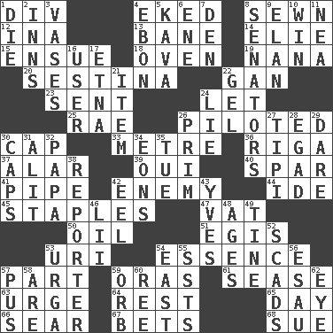 ACROSS 1. HTML Container Element 4. Supplemented with great effort 8. Stitched 12. _ tizzy (2 wds.) 13. Object of repulsion 14. Writer Wiesel 15. Follow as a consequence or result 18. Baking chamber 19. Nanny 20. French poetic form 22. Separate the seeds from cotton 23. Emitted 24. Allow 25. Actress Charlotte 26. Manned the helm 30. Head covering 33. Distance measurement (Brit.) 36. Port city in Latvia 37. Having or resembling wings 39. Fr. "Yes" 40. Practice fight 41. Corncob 42. Foe 44. Binary compound 45. Paper fasteners 47. Large container 50. Petroleum 51. The front part of a cuirass 53. RI univ. 54. Center 57. Role in a play 59. Mouths or openings 61. Gospel singer Marvin 63. Goad 64. Relief 65. 24 hours 66. Shrivel 67. Wagers 68. Institute legal proceedings DOWN 1. Pass on 2. Lodging establishments 3. Flower holders 4. Inky black, to poets 5. Polynesian shrub of the pepper family 6. Compass dir. 7. Lair 8. Elected representatives 9. Liveliness 10. Victory 11. Teachers' org. 16. One who makes use of a thing 17. Inactive volcano in Sicily 21. Detail 22. Set 24. Whopper 26. Demure 27. Native american tent (variation) 28. Mild oath 29. Have the gumption 30. Smile enhancers 31. Came down and settled, as after flight 32. Dad 34. Immeasurably long periods of time 35. Third day of the wk. 38. News announcer 42. Snakelike fish 43. Jacques Cousteau's middle name 46. Cards in a Roman deck? 48. Grows older 49. Prong on a fork 52. Heaps 53. Capital and largest city of Mongolia 54. 90 degrees 55. Fast planes 56. He sold his birthright 57. Product of festering 58. "We ___ not amused" (Victoria) 59. Globe 60. Portuguese money of account (variant) 62. Sight organ