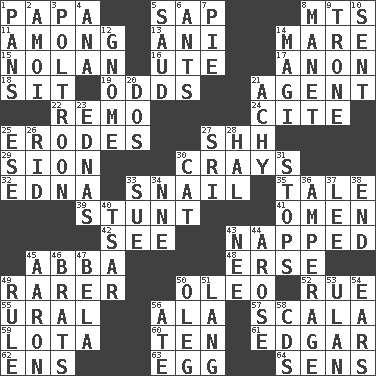 ACROSS 1. Dad 5. Plant excrement 8. Mountains (abbr.) 11. Amid 13. Cuckoo 14. Female horse 15. Pitcher Ryan 16. Shoshoni 17. Soon (poet.) 18. Be seated 19. Probability 21. Rep 22. San ____ (Riviera town) 24. Quote 25. Eats (away) 27. Quiet! 29. The Jewish people; Israel 30. Trading vessels 32. Pulitzer Prize-winning author Ferber 33. Slow-paced one 35. Lie 39. Difficult or unusual or dangerous feat 41. Sign of things to come 42. Observe 43. Slept 45. Swedish rock group 48. Celtic language 49. More valued for its uncommonness 50. Butter sub 52. Regret 55. Mountain range 56. Insect wing 57. Any of the three canals of the cochlea 59. Globular water bottle used in Asia 60. Nine, plus one 61. _ Allan Poe 62. Followers of ems 63. Ovum 64. Elected reps. DOWN 1. Zero-star reviews 2. Mine, in Marseilles 3. Characterized by complete cowardliness 4. Santa ___, CA 5. Saudi Arabian king (1953-1964) 6. Pismires 7. Sliced dessert 8. French painter Edouard 9. Marketplace scale 10. Transmitted 12. Dwarf 14. Wise men 20. Two (Sp.) 21. Painful 23. Ferber et al. 25. Compass dir. 26. To free from 27. Indian title of respect (Mr.) 28. Actor Linden 30. Feline 31. Halts 33. Institute legal proceedings 34. Compass dir. 36. Electrical Measurement 37. Area sheltered from the wind 38. Conclude 40. Russian ruler of old 43. Born 44. Came up 45. Composer Copland 46. Naughty children 47. Actor Lugosi 49. General guideline 50. Cassini of fashion 51. Long (Scottish) 53. Uhlan (variant) 54. Hearing organs 56. Had dinner 58. Music discs