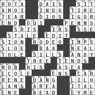 ACROSS 1. Round or rotation of duties 5. Raised platform 9. Be seated 12. Mine, in Marseilles 13. _ china 14. Hoop that covers a wheel 15. Pull into pieces 16. "Vaya con ____" 17. Russian composer Stravinsky 18. Conclude 19. Fr. "Yes" 21. Actor Sean's family 22. Indian titles of respect 24. Big collection agency 26. Compass dir. 27. Having lost freshness 28. Prepare for publication 29. The Jewish people; Israel 30. Cowboy competition 32. Naughty children 36. _ gin 37. Sound made by sheep 38. Be tempered by heat 39. Lacquered or enameled metalware 40. Beverly of Met fame 42. "60 Minutes" Commentator Rooney 43. Relationship diagram 44. Is inclined (to) 46. Crowd into 49. Part of HMS, perhaps 50. At sea 51. Learning spot: Fr. 53. Followers of ems 54. 4-wheeled motor vehicle 57. French philosopher Descartes 58. Mild oath, euphamism for damn 61. _ and Stitch 62. Austrian-born American filmmaker Fritz 63. Type of rug 64. Slanted text style (abbr.) 65. Compass dir. 66. Necklace unit 67. Jane of fiction DOWN 1. Assign a rank or rating to 2. Sign of something about to happen 3. Inedible or poisonous agaric 4. Atmosphere 5. "You Light Up My Life" star Conn 6. Cuckoo 7. Wedding promise 8. Distress signal 9. Public displays of written messages 10. Removes the wrinkles 11. Laconic 14. Standoff 19. Petroleum 20. One who uses or employs something 21. Pacific Standard Time (abbr.) 23. Indian princess (variant) 24. Perfect 25. River (Sp.) 27. Grain storage tower 28. Peak District village in England 29. Fast jet (abbr.) 31. Off-Broadway awards 32. Silly 33. Ananias' fault 34. Writing tablets 35. Secret 40. _ Lanka 41. Comedian Laurel of Laurel & Hardy 43. Definite Article 45. Curvy letter 46. Haggard of country music 47. Sea 48. Maid-servant 52. Part of a journey 53. Mild oath 55. Having or resembling wings 56. Hero or heavy, e.g. 58. Pat or tap gently 59. "We ___ not amused" (Victoria) 60. Teachers' org. 61. Whopper