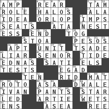 ACROSS 1. Electrical Unit 4. Stern 8. Scottish cap 11. Hero or heavy, e.g. 13. Rings 15. Insect wing 16. The main thing one is thinking about 17. Lowest deck of a ship 18. Naughty children 19. Theater features 21. _ moment's notice (2 wds.) 22. Egg locale 23. Curvy letter 24. Conclude 27. Coat; cloak 29. Portico 30. Mexican monetary units 34. Fitting 36. A single undivided whole 39. Sadhe (variant) 40. One who doesn't tell the truth 41. Sir (Sp.) 43. Event that recurs at intervals 44. Ferber et al. 46. Suttee (variant) 47. Raised railways 48. Trials 49. Mild oath 51. Nine, plus one 53. To free from 54. Floor protector 57. Printing process, for short 60. White ___ sheet 63. A sleeping potion; an opiate (poet.) 65. "Terrible" tsar 66. Leg coverings 69. Play the lead 70. Directed 71. Nick name for Arthur 72. Soaks 73. Followers of ems 74. At sea 75. Portuguese money of account (variant) DOWN 1. Ascend 2. Methods 3. Entreaties 4. 17th letter of the Greek alphabet 5. Hearing organ 6. Silent film actress Nazimova 7. Carrot, for example 8. Not wild 9. High mountains 10. Vertical spar for supporting sails 12. Consume 14. Argument over a trivial matter 18. Swallowed 20. Arrange properly for use 25. Horse sense 26. Natives or inhabitants of Denmark 28. Elect 29. Ski resort town in Vermont 31. Move on water 32. Probability 33. Perceive with the eye 34. Assistant 35. Baking dishes 37. _ tizzy (2 wds.) 38. Carrier 40. Allow 42. Swiss mountan, "Queen of the Mountains" 45. Compass dir. 50. Increase 52. California wine valley 54. Mother 55. Having winglike extensions 56. Laconic 57. Cause heat under the collar 58. Baking chamber 59. Bits 61. "Two Mules for Sister ____" 62. Pismires 64. Compass dir. 67. Neckwear 68. Ocean