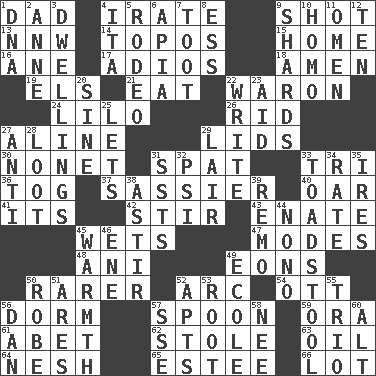 ACROSS 1. Male parent 4. Feeling or showing extreme anger 9. Guess 13. Compass dir. 14. Literary convention 15. Residence 16. One (Scot) 17. Goodbye (Sp.) 18. So be it 19. Raised railways 21. Erode 22. Make _____ (do battle with) 24. _ and Stitch 26. To free from 27. Place in a line 29. Flaplike coverings 30. Music written for nine 31. Petty quarrel 33. Three (prefix) 36. Coat; cloak 37. More disrespectful 40. Rowing implement 41. ___ a Wonderful Life 42. Use a swizzle stick 43. Related on the mother's side 45. Moistens 47. Methods 48. Black tropical American cuckoo 49. Immeasurably long periods of time 50. More uncommon 52. Curve 54. Baseball player Mel 56. Dormintory (informal) 57. Soup utensil 59. Mouth or opening 61. Collude with 62. Fur scarf 63. Petroleum 64. Soft 65. First name in cosmetics 66. Car dealer's back yard DOWN 1. Heredity factor (abbr.) 2. Singer Murray 3. Residences 4. Call ___ day 5. Cowboy competition 6. Capital of Western Samoa 7. A blast of a horn 8. Double-curved letter 9. Pottery fragments 10. Like (prefix) 11. Sign of things to come 12. Nine, plus one 20. Trig term 22. Compose 23. Help 25. Allows 27. Opposed to 28. Spoils 29. Den 31. Fast planes 32. 23rd letter of the Greek alphabet 33. Inedible or poisonous agaric 34. Assign a rank or rating to 35. Angers 38. Having gotten out of bed 39. San ____ (Riviera town) 44. Words to Nanette 45. Heat 46. Compass dir. 49. Learning spot: Fr. 50. Loose flowing garment 51. Ancient Greek god of war 52. Flats, for short 53. Carrot, for example 55. Musical group of three 56. Daniel's nick name 57. Compass dir. 58. Born 60. Keyboard modifier key