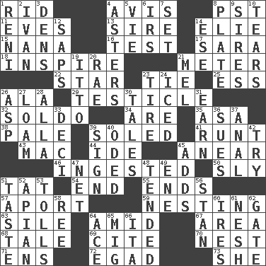 ACROSS 1. To free from 4. Opinion 8. Pacific Standard Time (abbr.) 11. Nights before holidays 13. Title for a man of rank and authority 14. Writer Wiesel 15. Nanny 16. Trial 17. "Two Mules for Sister ____" 18. Heighten or intensify 21. Distance measurement 22. Play the lead 23. Make a knot 25. Double-curved letter 26. Wing 29. One of the two male reproductive glands 32. Twentieth part of a lira 34. "We ___ not amused" (Victoria) 35. White ___ sheet 38. Diluted with white 39. Having a sole or soles 41. Undersized animal 43. Apple computer (short form) 44. Binary compound 45. Approach 46. Consumed 50. Wily 51. Make lace 54. Conclude 55. Extremities 57. To the left, to Queeg 59. Nestling 63. Drop; flow; fall 64. Among 67. Type of rug 68. Story 69. Quote 70. Egg locale 71. Followers of ems 72. Mild oath 73. A female animal or person DOWN 1. Painter Guido (1575-1642) 2. _ the terrible 3. Habitations of wild animals 4. Michaelmas daisies 5. Compete 6. Big collection agency 7. Arrange properly for use 8. Food holder 9. Fathers 10. Rends 12. Plant excrements 14. Compass dir. 19. "Tell ____ the Marines!" 20. Actress Charlotte 21. Cartoonist voice _ Blanc 23. Hoop that covers a wheel 24. On the rocks 26. Viper 27. Rich soil 28. Silent film actress Nazimova 30. Lies 31. Merit 33. Tenth: prefix 36. Takes to court 37. Of or related to the anus 39. Omen 40. Wrote a lyric poem 42. Attempt to accomplish something 45. Sums up 47. Remaining after all deductions 48. Looked after 49. Compass dir. 51. Clothes sense 52. Bee-related 53. For Whom the Bell _____ 56. Comedian Laurel of Laurel & Hardy 58. To sift 60. Angers 61. Tender 62. Yard entry 64. Adept person 65. Russian fighter aircraft 66. Call ___ day