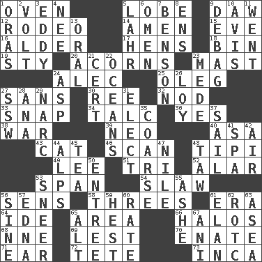 ACROSS 1. Baking chamber 5. Ear part 9. Simpleton 12. Cowboy competition 14. So be it 15. Night before a holiday 16. Tree or shrub in the Birch family 17. Coop moms 18. Storage container 19. Filthy place 20. Oak nuts 23. Vertical spar for supporting sails 24. Actor Baldwin 25. Cassini of fashion 27. Without 30. To separate or throw off 32. Allow head to fall sleepily 33. Fastener 34. Baby powder 36. Affirmative reply 38. Armed conflict 39. Modern: prefix 40. White ___ sheet 43. Feline 46. Examine hastily 48. Native american tent (variation) 49. Area sheltered from the wind 51. Three (prefix) 52. Having or resembling wings 53. Connect, as a bridge 54. Cole _ (cabbage dish) 56. Elected reps. 58. Trios 61. Period 64. Binary compound 65. Type of rug 66. Radiant circles of light 68. Compass dir. 69. For fear that 70. Maternal 71. Ewer handle 72. False hair 73. South American Indian DOWN 1. Mouths or openings 2. Electrical Unit 3. Whirlpool 4. Born 5. Cowardly lion portrayer 6. Sign of something about to happen 7. Gillaume's butler role 8. Followers of ems 9. Debunk (Brit. slang) 10. Opinion 11. Left 13. Of the mouth 21. An absolute certainty 22. Seas 23. Ancient Persian 24. Cleo's killer 26. Myrna of the movies 27. Compass dir. 28. Santa ___, CA 29. Drug cop 31. Voters do this 35. Unrefined 37. Travel by water 41. Health resort 42. Wind 44. High mountains 45. Beverage made from leaves 47. Mediterranean tributary 48. The 23rd letter of the Hebrew alphabet 50. Main course 53. Scornful expression 55. American tennis player Robert 56. Trig term 57. Pulitzer Prize-winning author Ferber 59. Command 60. Assign a rank or rating to 61. Liveliness 62. College mil. group 63. Toward the sea 65. Keyboard modifier key 67. Black tropical American cuckoo