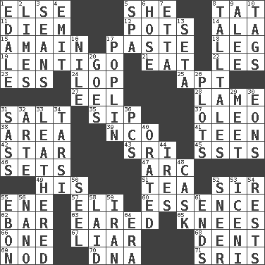 ACROSS 1. Otherwise 5. A female animal or person 8. Make lace 11. South Vietnam president (1954) 12. Cooking vessels 14. Chicken ___ king 15. With great haste 17. Thick mixture 18. Part of a journey 19. Small, flat, pigmented spot on the skin 21. Ingest 22. French article 23. Curvy letter 24. Chop off 25. Fitting 27. Snakelike fish 28. Unable to walk 31. Table seasoning 35. Small drink 37. Margarine 38. Type of rug 39. Non-commissioned officer (abbr.) 41. Adolescent 42. Play the lead 43. _ Lanka 45. Fast planes 46. Puts into a specified state 47. Curve 49. Part of HMS, perhaps 51. Beverage made from leaves 52. Title for a knight 55. Compass dir. 57. Connecticut Ivy Leaguer 60. Substance 62. Drinking establishment 63. Having ears or earlike features 65. Leg joints 66. Single 67. One who doesn't tell the truth 68. Gouge 69. Dreamland 70. Heredity factor (abbr.) 71. Indian titles of respect DOWN 1. Peak District village in England 2. Citrus fruits 3. Actors Connery and Penn 4. Give off 5. Health resort 6. Flexible conduit 7. Singer James 8. Baron Munchausen's specialties 9. Toward shelter 10. Labels 13. Stalk of a moss capsule 16. Mediterranean tributary 17. Cotton for raincoats, e.g. 20. Moves 26. Schemes 29. Rendezvous 30. Immeasurably long periods of time 31. Backtalk 32. Johnson of "Laugh-In" 33. Resembling or made to resemble leather 34. Tarsus (plural) 36. Personal Computers (abbr.) 40. Declaimed 44. Angers 48. Keg 50. Stitch closed the eyes of (a falcon) 52. Contemptuous expression 53. Ancient Celtic tribe of eastern Britain 54. Musical pauses 55. Inky black, to poets 56. Billionth: prefix 58. Put down 59. SW Asia republic 61. Extremities 64. Epoch
