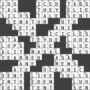 ACROSS 1. Wedding promise 4. On the rocks 8. Bar bills 12. Label 13. Those people 14. Writer Wiesel 15. Grain storage towers 18. Lie 19. Posted 20. Legislator 22. Shoshoni 23. Stalk of a moss capsule 24. Cuckoo 25. Title for a knight 26. Winter's stalactites 30. R.R. building 33. Miss Universe 1986, Barbara Palacios _ 36. Old wives' tales, e.g. 37. Chops off 39. Unit of force equal to gravity 40. Otherwise 41. Came down and settled, as after flight 42. Rhinal 44. French article 45. Had a strong desire 47. White ___ sheet 50. A saturated hydrocarbon 51. Not women's 53. Had dinner 54. Pertaining to the sea 57. Gouge 59. Not recorded 61. Exchanges for money 63. To the inside or interior of 64. Locale of original sin 65. Nilotic language 66. Distinctive style or manner 67. Portable shelter 68. Elected rep. DOWN 1. It is 2. Raised platform 3. Stares 4. "Tell ____ the Marines!" 5. Burn to charcoal 6. Snakelike fish 7. Color 8. A testis 9. Toward shelter 10. Storage container 11. Put into a specified state 16. Washington bills 17. Suttee (variant) 21. Small pie 22. Corn or form start 24. Adept person 26. The content of cognition 27. Hang loosely or laxly 28. Celtic language 29. Observes 30. Kill 31. Lacquered or enameled metalware 32. Capital of Western Samoa 34. Mild oath 35. Consenting reply 38. Ski resort town in Vermont 42. Born 43. Unable to walk 46. Compass dir. 48. Oceans 49. Singer Murray 52. Beverly of Met fame 53. Against 54. Baking chamber 55. Penny 56. A slight indication 57. HTML Container Element 58. Compass dir. 59. Allow 60. Binary compound 62. Male child