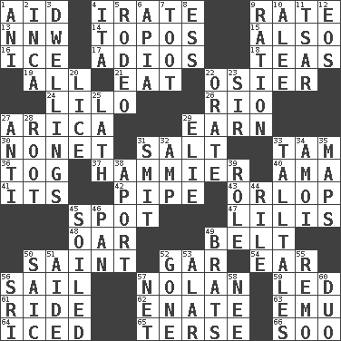 ACROSS 1. Assist 4. Feeling or showing extreme anger 9. Pace 13. Compass dir. 14. Literary convention 15. In addition 16. Frozen water 17. Goodbye (Sp.) 18. Beverages made from leaves 19. 100% 21. Consume 22. Flexible twig of a willow tree 24. _ and Stitch 26. _ de Janeiro 27. N. Chile seaport 29. Merit 30. Music written for nine 31. Table seasoning 33. Scottish cap 36. Coat; cloak 37. More overdramatic by comparison 40. Nursemaid (var.) 41. ___ a Wonderful Life 42. Corncob 43. Fourth or lowest deck 45. Blemish 47. Ms. Damita and namesakes 48. Boat paddle 49. Waist strap 50. Inhabitant of Heaven 52. Slender fish 54. Ewer handle 56. Move on water 57. Pitcher Ryan 59. Directed 61. Travel on or in a vehicle 62. Related on the mother's side 63. Australian flightless bird 64. On the rocks 65. Laconic 66. "Barney Miller" actor Jack DOWN 1. Cuckoo 2. South American Indian 3. Residences 4. Call ___ day 5. Cowboy competition 6. Capital of Western Samoa 7. A blast of a horn 8. Curvy letter 9. Food allowance for one day 10. Toward shelter 11. Russian ruler of old 12. Greek goddess of the dawn 20. Louse (plural) 22. Speak pompously 23. Title for a knight 25. Thin strip of wood or metal 27. Against 28. Carrot, for example 29. Writer Wiesel 31. Stricken, poetically 32. Electrical Unit 33. Baron Munchausen's specialties 34. Mine, in Marseilles 35. Atlas contents 38. To the left, to Queeg 39. Hero or heavy, e.g. 44. Cause heat under the collar 45. Dirtied 46. Baking dish 49. Naughty children 50. Ketch in the Levant 51. Assistant 52. Went 53. Having or resembling wings 55. San ____ (Riviera town) 56. Indian title of respect (Mr.) 57. Remaining after all deductions 58. Born 60. Superhero pair