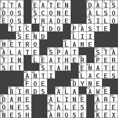 ACROSS 1. Call ___ day 4. Consumed 9. Raised platform 13. Two (Sp.) 14. Biscuitlike quick bread 15. In addition 16. Greek goddess of the dawn 17. Buy and sell 18. Grain storage tower 19. Nervous spasm 21. Wedding promise 22. Thick mixture 24. Transmit 26. Cards in a Roman deck? 27. Paris' subway 29. Unable to walk 30. Having winglike extensions 31. Argument over a trivial matter 33. R.R. building 36. Shallow baking pan 37. Cordwainer's material 40. For each 41. Arrange properly for use 42. Play the lead 43. Related on the mother's side 45. Opposed to 47. Shoestrings 48. Enemy 49. Centimeter-gram-second unit of force 50. Avian creatures 52. According to 54. Deep reverence 56. Have the gumption 57. Place in a line 59. Nonscientific branch of learning 61. Washington bills 62. Lies 63. Untruth 64. Delicate 65. Came up 66. A weed DOWN 1. Binary compound 2. A blast of a horn 3. Helper 4. Eastern Standard Time (abbr.) 5. Bitter 6. Frog relative 7. Inside; within (prefix) 8. Born 9. Small ungulate mammals of Africa 10. Came down and settled, as after flight 11. Small island 12. "Barney Miller" actor Jack 20. Sure thing 22. Food holder 23. Direct toward a target or goal 25. Christmas carol 27. Floor coverings 28. Writer Wiesel 29. Cowardly lion portrayer 31. Suttee (variant) 32. Parent Teacher Association (abbr.) 33. High altitude stroll 34. Wig 35. Ancient Greek god of war 38. _____ Park, CO 39. Have trust in 44. Grandmother 45. Anew 46. Lower and raise head in agreement 49. Natives or inhabitants of Denmark 50. Object of repulsion 51. Angers 52. Having or resembling wings 53. _ and Stitch 55. One of the Great Lakes 56. Spanish title 57. _ moment's notice (2 wds.) 58. Compass dir. 60. John Ritter's dad
