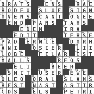 ACROSS 1. Naughty children 6. Followers of ems 9. Actress Charlotte 12. Cowboy competition 13. Change direction abruptly 14. Omen 15. Baking chambers 16. Patter 17. Double curve, resembling the letter S 18. Conclude 19. Baking dishes 20. Scottish caps 21. Genesis locale 23. Retirement account (abbr.) 24. Prepare for publication 25. Laconic 28. Writing tablet 30. Bert's buddy 34. Dormintory (informal) 35. Cuckoo 36. Flexible twig of a willow tree 38. Cards in a Roman deck? 39. Ear part 41. Having threads 43. Eastern Standard Time (abbr.) 44. Shopping centers 46. Vintage cars 48. Biblical high priest 49. Fermented drink made from hops 50. In a ____ (agitated or irritated) 51. One who uses or employs something 53. She-sheep 56. Butter sub 57. Spoken 58. Hits or strikes with great force 60. Take ten 61. Political cartoonist Thomas 62. Having gotten out of bed 63. Music discs 64. Raised railways 65. _ dish (used to culture cells) DOWN 1. Sis' sibling 2. Be footloose 3. An important port of Yemen 4. Looked after 5. Distress signal 6. Enthusiasm 7. Religious women 8. Arrange properly for use 9. Frustrating wastes of time 10. Matures 11. Compass dir. 13. Examine hastily 14. Flew 19. Stone: prefix 20. Teat (slang) 22. Pass on 24. The property of being fit to eat 26. Indian titles of respect 27. Send forth 28. Inside of hand 29. Small Philippine buffalo 31. Overdraft (abbr.) 32. One more than two 33. Snakelike fish 37. Less widely known 40. American author Paul (1891-1958) 42. To separate or throw off 45. Be seated 47. Threatening words 49. Waist strap 50. Downhill vehicle 51. Mountain range 52. Backtalk 54. Electrical Unit 55. Independent ruler or chieftain 56. The grampus (Milton) 57. Single 58. Plant excrement 59. _ Lanka