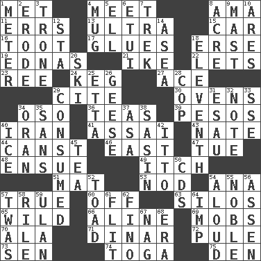 ACROSS 1. Was introduced to 4. Rendezvous 8. Nursemaid (var.) 11. Blunders 13. Extreme 15. Automobile 16. A blast of a horn 17. Adhesives 18. Celtic language 19. Ferber et al. 21. D.D.E's nickname 22. Allows 23. Portuguese money of account (variant) 24. Barrel 27. Adept person 29. Quote 30. Baking chambers 34. Bear (Spanish) 36. Beverages made from leaves 39. Mexican monetary units 40. SW Asia republic 41. Slender Brazilian palm 43. Nathan's nickname 44. 2nd pers. sing. pres. of can (arch.) 46. 90 degrees 47. Third day of the wk. 48. Follow as a consequence or result 49. Hankering 51. Floor covering 53. Dreamland 54. Santa ___, CA 57. Loyal 60. Below a satisfactory level 63. Grain storage towers 65. Uncontrolled 66. Place in a line 69. Disorderly crowds 70. Insect wing 71. Middle Eastern gold or silver currency 72. Whimper 73. Elected rep. 74. Ancient Roman robe 75. Lair DOWN 1. Distance measurement 2. Wear away 3. Marketplace scale 4. Large cup 5. Pipe bend 6. Needle holder 7. Long journey 8. Measure of real estate 9. Vertical spar for supporting sails 10. Ancient Greek god of war 12. R.R. building 14. At sea 18. Veterans Day date 20. What Jean-Claude Killy likes to do 25. Singer James 26. Honkers 28. Police officer (slang) 29. Ingested 31. Son of Isaac 32. Musical sound 33. Compass dir. 34. Northwest Algerian city 35. Without 37. White ___ sheet 38. Indian antelope 40. Frozen water 42. "Tell ____ the Marines!" 45. Beverage made from leaves 50. Music discs 52. Frog relative 54. Verbally 55. Impressive in appearance 56. NE Netherlands city 57. It was, poetically 58. Cause heat under the collar 59. Uhlan (variant) 61. Sudden quick movement 62. A pale, very dry sherry 64. Naughty child 67. Tired old horse 68. Period