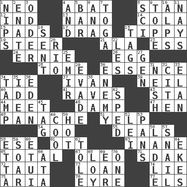 ACROSS 1. Modern: prefix 4. Blind as ____ 8. Comedian Laurel of Laurel & Hardy 12. Indiana (abbr.) 13. Billionth: prefix 14. Root beer relative 15. Writing tablets 17. To trail on the ground 18. Likely to tip or tilt 19. Bull 21. According to 23. Curvy letter 24. Bert's buddy 26. Ovum 28. Heavy book 30. Gist 34. Neckwear 37. _ the terrible 39. Famous astronaut Armstrong 40. Say or write further 41. All-night dance parties 43. R.R. building 44. Rendezvous 46. Moist 47. Layer 48. Flamboyance 51. Sharp bark 54. Thick or sticky substance 55. Allots cards 58. Compass dir. 61. Baseball player Mel 63. Lacking in sense or substance 65. Add up to 67. Butter sub 71. Neighbor of Neb. 72. Pulled tight 73. Grant temporary use of 74. Untruth 75. Operatic vocal solo 76. Jane of fiction 77. Raised railways DOWN 1. Cuts off 2. Maternal 3. More peculiar 4. Plus 5. Tavern 6. Santa ___, CA 7. Ancient Roman robe 8. _-fi 9. Drink excessively 10. High mountains 11. Negative votes 16. Emitted 18. Labels 20. _ de Janeiro 22. French article 25. Independent ruler or chieftain 27. Commissioned mil. rank 29. Dodge 30. Foe 31. Soft 32. Quote 33. Enthusiasm 34. Pack (down) 35. The content of cognition 36. Paradise 38. Actress Gardner 42. Hurried 45. Label 49. Calm and collected 50. Being at a high temperature 52. Luau accessory 53. Baking dishes 56. Dipping utensil 57. Slow-paced one 58. Singer James 59. Fly high 60. Needle case 62. Lacquered or enameled metalware 64. Supplements with great effort 66. _ moment's notice (2 wds.) 68. Myrna of the movies 69. Hearing organ 70. Single
