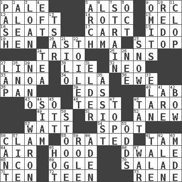 ACROSS 1. Light colored 5. In addition 9. The grampus (Milton) 12. High up in or into the air 14. College mil. group 15. Cartoonist voice _ Blanc 16. Theater features 17. Draw slowly or heavily 18. Wedding promise 19. Layer 20. Respiratory problem 23. Obstruct or block passage 24. Musical group of three 25. Restaurants 27. Actor's bit 30. Whopper 32. Modern: prefix 33. Small Philippine buffalo 34. Water jar 36. She-sheep 38. Baking dish 39. Begley and Asner 40. Experiment locale 43. Bear (Spanish) 46. Trial 48. Edible starchy tuberous root 49. It is 51. _ de Janeiro 52. Afresh 53. Electrical Unit 54. Blemish 56. Dollar (slang) 58. Declaimed 61. Scottish cap 64. Wind 65. Parka part 66. A sleeping potion; an opiate (poet.) 68. Non-commissioned officer (abbr.) 69. Stare at amorously 70. Vegetable dish 71. Nine, plus one 72. Adolescent 73. French philosopher Descartes DOWN 1. Romantic infatuation 2. Toward shelter 3. Grant temporary use of 4. Lizard (obsolete) 5. Bowlike part 6. Rich soil 7. Put through a sieve 8. Sep. follower 9. Leaves out 10. Redecorate 11. Hoof sound 13. Russian ruler of old 21. Grain storage tower 22. Rest room 23. Overwhelm 24. Afternoon social gathering 26. Born 27. Pet locale 28. _ tizzy (2 wds.) 29. Words to Nanette 31. A person who is older than you are 35. Help 37. Enthusiasm 41. "We ___ not amused" (Victoria) 42. Ribbon knot 44. Thailand, formerly 45. Baseball player Mel 47. Drink excessively 48. Make lace 50. Moe Howard, for one 53. Make _____ (do battle with) 55. Likelihood 56. Patter 57. Louse (plural) 59. Hero or heavy, e.g. 60. An important port of Yemen 61. Lie 62. Actor Alda or Thicke 63. Ancient Persian 65. Being at a high temperature 67. Armed conflict