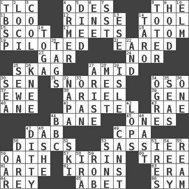 ACROSS 1. Affectionate concern, for short 4. Lyric poems 8. Definite Article 11. Sometimes accompanies a hiss 12. Remove soap 14. Utensil 15. Highlander 17. Confronts 18. Tiny particle 19. Manned the helm 21. Having ears or earlike features 23. Slender fish 24. And not 25. Heroin 27. Among 30. Elected rep. 31. Sounds asleep 34. Bear (Spanish) 37. She-sheep 38. Satellite of Uranus 39. Commissioned military rank (abbr.) 40. One (Scot) 41. Soft color 43. Actress Charlotte 44. Object of repulsion 45. Washington bills 47. Apply (a substance) by light strokes 49. Tax preparer (abbr.) 50. Flat circles 52. More lively and spirited 56. Pledge 57. Japanese brewing company 60. Woody plant 61. Johnson of "Laugh-In" 62. Removes the wrinkles 63. Period 64. Marina Del _, California 65. Collude with 66. Symbol (abbr.) DOWN 1. Cook's measure (abbr.) 2. Event scenes 3. Calm and collected 4. Channel Islands abalone 5. Passed on 6. Compass dir. 7. Fast jet (abbr.) 8. Carrier 9. Parka part 10. Shade tree 13. Compass dir. 14. Pacific island yam 16. Ancient Roman robe 20. Labels 22. Added to 25. Stitched 26. Leg joint 27. Ascend 28. Confront 29. Small island 30. Ocean 32. California wine valley 33. Northwest Algerian city 34. Legendary monster 35. Oceans 36. Single 42. Chops off 44. English channel? 46. Political cartoonist Thomas 47. Short, simple song 48. American tennis player Robert 49. 2nd pers. sing. pres. of can (arch.) 50. Have the gumption 51. What Jean-Claude Killy likes to do 52. Trig term 53. Angers 54. Suggestive of the supernatural 55. 480, 500 or 516 sheets of paper 56. Boat paddle 58. Retirement account (abbr.) 59. Director Reiner