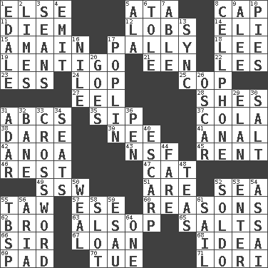 ACROSS 1. Otherwise 5. _ moment's notice (2 wds.) 8. Head covering 11. South Vietnam president (1954) 12. Tennis shots 14. Biblical high priest 15. At full speed 17. Friendly 18. Area sheltered from the wind 19. Small, flat, pigmented spot on the skin 21. Car or cant ending 22. French article 23. Curvy letter 24. Trim (branches) 25. Police officer (slang) 27. Snakelike fish 28. "______ My Girl" (Turtles hit) 31. Lettered men learn these first 35. Small drink 37. Root beer relative 38. Have the gumption 39. Born 41. Of or related to the anus 42. Small Philippine buffalo 43. Overdraft (abbr.) 45. Monthly bill 46. Respite 47. Feline 49. Compass dir. 51. "We ___ not amused" (Victoria) 52. Ocean 55. The 23rd letter of the Hebrew alphabet 57. Compass dir. 60. Thinks logically 62. Sis' sibling 63. Columnist Joseph or Stewart 65. Table seasonings 66. Title for a knight 67. Grant temporary use of 68. The main thing one is thinking about 69. Groovy apt. 70. Third day of the wk. 71. Australian parrot (variant) DOWN 1. Peak District village in England 2. Citrus fruits 3. Seines 4. Send forth 5. Chicken ___ king 6. Lacquered or enameled metalware 7. Competent 8. Portable communications device 9. Toward shelter 10. Sliced desserts 13. Synchronize (abbr.) 16. "Death on the ____" 17. Cotton for raincoats, e.g. 20. Moves 26. Witty Wilde 29. Style 30. Table seasoning 31. The sixth month of the Jewish calendar 32. Object of repulsion 33. What you're doing now 34. Theater features 36. Animal enclosure 40. Fortification 44. Conductor's collection 48. Afternoon social gatherings 50. Welt 52. Twentieth part of a lira 53. Keyboard key 54. Slender Brazilian palm 55. Cook's measure (abbr.) 56. Operatic vocal solo 58. Groove 59. He sold his birthright 61. Move on water 64. Single