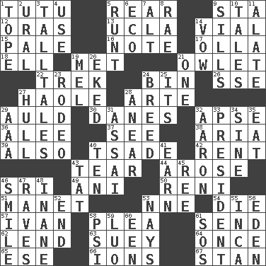 ACROSS 1. Ballerina skirt 5. Located in or toward the back 9. R.R. building 12. Mouths or openings 13. Southern CA. univ. 14. Small bottle 15. Light colored 16. Make mention of 17. Spanish pot 18. Pipe bend 19. Was introduced to 21. A small or young owl 22. Long journey 24. Storage container 26. Compass dir. 27. White Person, in Hawaii 28. Johnson of "Laugh-In" 29. Old (Scot.) 30. Natives or inhabitants of Denmark 32. Domed church section 36. Toward shelter 37. Perceive with the eye 38. Roberta Peters solo 39. In addition 40. Sadhe (variant) 42. Monthly bill 43. Pull apart 44. Came up 46. _ Lanka 49. Cuckoo 50. Painter Guido (1575-1642) 51. French painter Edouard 53. Compass dir. 54. Expire 57. "Terrible" tsar 58. Entreaty 61. Post 62. Grant temporary use of 63. Chop _ 64. Single time 65. Compass dir. 66. Charged atoms 67. Comedian Laurel of Laurel & Hardy DOWN 1. Drink excessively 2. Mountain range 3. Baron Munchausen's specialties 4. Purpose 5. The smallest animal of a litter 6. Environmental prefix 7. Keyboard modifier key 8. Actress Charlotte 9. Beverly of Met fame 10. Falsehoods 11. Having winglike extensions 14. Solemn pledge 19. Cartoonist voice _ Blanc 20. Supplemented with great effort 21. Single 23. Cowboy competition 24. A special lineage 25. It is 27. Frame or body of a ship 28. Approach 29. American Automobile Association (abbr.) 31. Slender Brazilian palm 32. Composer Copland 33. Elected leader of a country 34. Trig term 35. Ingest 40. "___ Little Indians" 41. Merit 43. Make lace 45. To sift 46. Grin 47. All-night dance parties 48. Empty; void 52. Conclusion 53. Negative votes 55. South American Indian 56. Locale of original sin 58. 23rd letter of the Greek alphabet 59. Nilotic language 60. Car or cant ending 61. Mayday