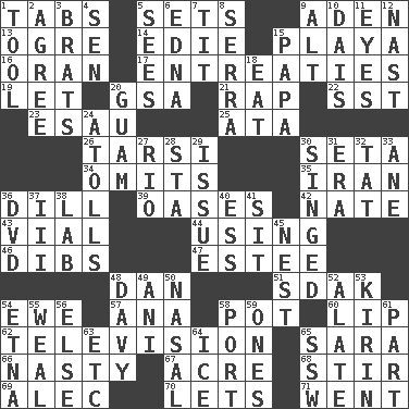 ACROSS 1. Bar bills 5. Arranges properly for use 9. Arabian gulf 13. Legendary monster 14. Singer Brickell 15. Beach, in Buenos Aires 16. Northwest Algerian city 17. Pleas 19. Allow 20. Girls' org. (abbr.) 21. Reproach for some lapse or misdeed 22. Fast jet (abbr.) 23. Son of Isaac 25. _ moment's notice (2 wds.) 26. Tarsus (plural) 30. Stalk of a moss capsule 34. Leaves out 35. SW Asia republic 36. Deli pickle 39. Fertile tracts in a desert 42. Nathan's nickname 43. Small bottle 44. Putting into practice 46. Rights 47. First name in cosmetics 48. Daniel's nick name 51. Neighbor of Neb. 54. She-sheep 57. Santa ___, CA 58. Cooking vessel 60. Mouth edge 62. Household entertainment appliance 65. "Two Mules for Sister ____" 66. Offensive 67. 43,560 square feet 68. Use a swizzle stick 69. Actor Baldwin 70. Allows 71. Gone DOWN 1. Utensil 2. Match 3. Naughty children 4. Elected rep. 5. Observes 6. Pulitzer Prize-winning author Ferber 7. Teat (slang) 8. Spanish missionary in California 9. Keyboard modifier key 10. Raised platform 11. Snake ____ (dice throw) 12. Political cartoonist Thomas 15. Dad 18. Ingest 20. Island territory of the United States 24. Ringlike coral islands and reefs 27. _ de Janeiro 28. R.R. building 29. Come out of 30. Burned superficially 31. Epoch 32. Make lace 33. A saturated hydrocarbon 36. Movie disc 37. One more than two 38. Experiment locale 40. Double-curved letter 41. Be seated 45. A home for chicks 48. American folk hero Crockett 49. Black tropical American cuckoo 50. Relating to the nose 52. Having winglike extensions 53. Japanese brewing company 54. Inactive volcano in Sicily 55. Welt 56. Otherwise 58. Sweet dark-red dessert wine 59. Singles 61. Role in a play 63. And so on (abbr.) 64. Frozen water 65. Compass dir.