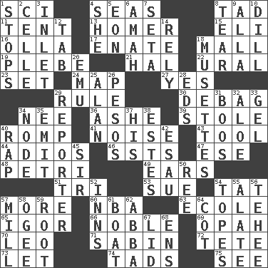 ACROSS 1. _-fi 4. Oceans 8. Small boy 11. Portable shelter 13. Simpsons dad 15. Biblical high priest 16. Rounded earthenware pot or jar 17. Related on the mother's side 18. Promenade 19. Military trainee 21. Actor Linden 22. Mountain range 23. Put into a specified state 24. Atlas unit 27. It is so 29. General guideline 30. Debunk (Brit. slang) 34. Born 36. American tennis player Robert 39. Fur scarf 40. Frolic 41. Annoying sound 43. Utensil 44. Goodbye (Sp.) 46. Fast planes 47. Compass dir. 48. _ dish (used to culture cells) 49. Hearing organs 51. Three (prefix) 53. Take to court 54. Make lace 57. Greater amount 60. Basketball assoc. 63. Learning spot: Fr. 65. Russian composer Stravinsky 66. Impressive in appearance 69. Brightly colored fish 70. Lion 71. Unit of acoustic absorption 72. False hair 73. Allow 74. Small amounts or degrees 75. Perceive with the eye DOWN 1. Discontinues 2. Cell (Danish) 3. An arm off of a larger body of water 4. A female animal or person 5. A really long time 6. Wet nurse 7. Bristle 8. Pull apart 9. Silent film actress Nazimova 10. Deli pickle 12. Bar bill 14. Have trust in 18. French bagpipes 20. Australian flightless bird 25. Actor Alda or Thicke 26. Mexican monetary units 28. Begley and Asner 29. Newsperson 31. Expressions of contempt or scorn 32. _ vera 33. Set 34. Thickened enlargement 35. Send forth 37. Part of HMS, perhaps 38. _____ Park, CO 40. Hit sharply and swiftly 42. He sold his birthright 45. Title for a knight 50. To sift 52. Restaurants 54. Drinks excessively 55. Having winglike extensions 56. Giggle 57. Place where flour is made 58. Double curve, resembling the letter S 59. Carrot, for example 61. Water vessel 62. Swedish rock group 64. Small bed 67. Hat (slang) 68. Followers of ems