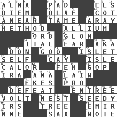 ACROSS 1. _ mater 5. Groovy apt. 8. Raised railways 11. South Vietnam president (1954) 12. Norwegian king 14. Small bed 15. Approach 17. Docile 18. Like ___ of sunshine 19. Mode 21. Plant genus of onion and garlic 23. Globe 25. Seize upon or latch onto something 26. Slanted text style (abbr.) 27. Ewer handle 28. Alias (abbr.) 31. Spanish title 33. Thick or sticky substance 35. Small island 37. Automatically 38. Island 40. Capri or Wight 41. Bodily heat indicating an inflammation 43. Opposite of masc. 45. Republican Party 46. Lyricist Gershwin 47. Nanny (var.) 50. (Had) reclined 52. Makes supply last 53. Adept person 54. Outscore 56. Main course 61. Electrical Unit 62. Egg locale 65. Sleazy 66. Big collection agency 67. Family _ (genealogy) 68. Arab leader 69. Madame (abbr.) 70. Saxophone 71. Musical sound DOWN 1. First of billions? 2. Actor's bit 3. Confront 4. Nursemaid 5. Plant holder 6. Wing 7. Break 8. Shade of tan 9. Rich soil 10. Filthy place 13. Chap (slang) 16. Carrot, for example 18. Direct toward a target or goal 20. To be drawn or hauled along 22. Australian parrot (variant) 24. Coalition 26. Information 28. In addition 29. Seaweed 30. Had dinner 31. Letter starter 32. Rounded earthenware pot or jar 34. Clumsy lout 36. Public display of a written message 37. _-fi 39. Sharp bark 42. Libertine 44. Female horse 48. Intended 49. Michaelmas daisies 51. Charged atoms 52. Lizard (obsolete) 54. Dormintory (informal) 55. Otherwise 57. Adolescent 58. San ____ (Riviera town) 59. Prepare for publication 60. Jane of fiction 61. Zeal 63. Ocean 64. John Ritter's dad