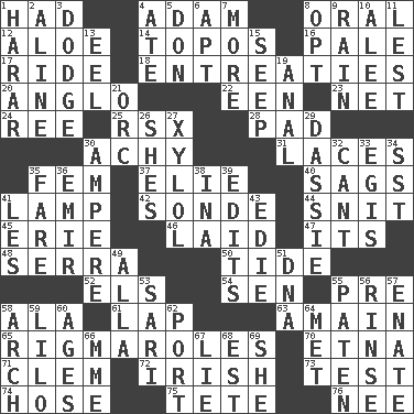 ACROSS 1. Possessed 4. First of billions? 8. Relating to the mouth 12. _ vera 14. Traditional theme or motif 16. Diluted with white 17. Travel on or in a vehicle 18. Pleas 20. White American of non-Hispanic descent 22. Car or cant ending 23. Remaining after all deductions 24. Portuguese money of account (variant) 25. Acura sports coupe 28. Groovy apt. 30. Painful 31. Shoestrings 35. Opposite of masc. 37. Writer Wiesel 40. Droops 41. Desk light 42. Message 44. In a ____ (agitated or irritated) 45. One of the Great Lakes 46. Put down 47. It is 48. Spanish missionary in California 50. Periodic rise and fall of the sea level 52. Raised railways 54. Elected rep. 55. Before (prefix) 58. In the manner of 61. Pet locale 63. With great haste 65. Frustrating wastes of time 70. Inactive volcano in Sicily 71. Clement's nick name 72. From or relating to Ireland 73. Trial 74. Stockings 75. False hair 76. Born DOWN 1. Ethiopian city, capital of Harari 2. Place in a line 3. Evade 4. Had dinner 5. Spanish title 6. Fitting 7. Greater amount 8. Choose 9. Precipitation 10. Toward shelter 11. For fear that 13. Snakelike fish 15. Ooze 19. Of or related to the anus 21. The grampus (Milton) 26. "______ My Girl" (Turtles hit) 27. Xylene (variant) 29. Small ungulate mammals of Africa 30. Electrical Unit 32. Patter 33. The front part of a cuirass 34. Fast jet (abbr.) 35. Conductor's collection 36. Arab leader 38. _ tizzy (2 wds.) 39. Prepares for publication 41. French article 43. Singer Brickell 49. Silent film actress Nazimova 51. Heredity factor (abbr.) 53. Indian skirt 55. Eucharist need 56. Remove soap 57. Maternal 58. Bowlike part 59. _ and Stitch 60. Matures 62. Left side of a ship or aircraft 64. Was introduced to 66. Madame (abbr.) 67. Whopper 68. Eastern Standard Time (abbr.) 69. A female animal or person