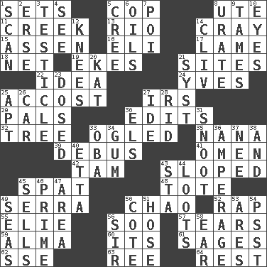 ACROSS 1. Arranges properly for use 5. Police officer (slang) 8. Shoshoni 11. Small stream 13. River (Sp.) 14. Supercomputer manufacturer 15. NE Netherlands city 16. Connecticut Ivy Leaguer 17. Unable to walk 18. Fish or hair follower 19. Makes supply last 21. Locates 22. The main thing one is thinking about 24. Jacques Cousteau's middle name 25. Buttonhole 27. Big collection agency 29. Friends 30. Proofreads 32. Woody plant 33. Stared 35. Grandmother 39. To get out of a bus 41. Presage 42. Scottish cap 43. Had an oblique or slanted direction 45. Petty quarrel 48. Carry 49. Father Junipero _ 50. US Secretary of Labor Elaine L. _ 52. Strike 55. Writer Wiesel 56. "Barney Miller" actor Jack 57. Separates forcefully 59. _ mater 60. ___ a Wonderful Life 61. Gurus 62. Compass dir. 63. To separate or throw off 64. Repose DOWN 1. Glance over 2. Celtic language 3. A testis 4. Observe 5. Algonquian 6. Lubricates 7. Luau course 8. A salt of uric acid 9. Makes less strong or intense 10. Sight organs 12. Leg joints 14. 154 in Roman numerals 20. Krazy ___ of comics 21. System (abbr.) 23. Administered medicine 25. Fitting 26. Automobile 27. Binary compound 28. To free from 30. Raised railways 31. Snob 33. Chief or king in Benin or Nigeria 34. Chewing product 36. Electrical Measurement 37. Born 38. Also 40. Singer James 43. R.R. building 44. Plunders 45. Exchanges for money 46. First class 47. Type of rug 49. Oceans 50. ____ d'Azur (French Riviera) 51. Flexible conduit 53. Ancient Greek god of war 54. Inconspicuous attention getter 56. Title for a knight 58. Ewer handle