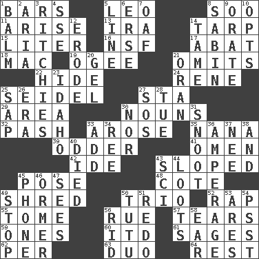 ACROSS 1. Oblong pieces of solid material 5. Lion 8. "Barney Miller" actor Jack 11. Get up 13. Retirement account (abbr.) 14. Canvas cover 15. 61 cubic inches 16. Overdraft (abbr.) 17. Blind as ____ 18. Apple computer (short form) 19. Double curve, resembling the letter S 21. Leaves out 22. Flintstone garb 24. French philosopher Descartes 25. Beer mug 27. R.R. building 29. Length times width 30. Parts of speech 32. Romantic infatuation 33. Came up 35. Nanny 39. More peculiar 41. Presage 42. Binary compound 43. Had an oblique or slanted direction 45. Introduce or present, as a question 48. ____ d'Azur (French Riviera) 49. Fragment 50. Musical group of three 52. Hit sharply and swiftly 55. Heavy book 56. Regret 57. Pulls apart 59. Washington bills 60. It would 61. Gurus 62. For each 63. Superhero pair 64. Repose DOWN 1. Lip ointment 2. Roberta Peters solo 3. Actors Guy, Robert Welles, and Clint 4. Compass dir. 5. Actor's bit 6. Celtic language 7. Clumsy lout 8. Unit of acoustic absorption 9. Speak pompously 10. Elects 12. Wear away 14. Docile 20. Set 21. Northwest Algerian city 23. Potato state 25. Plant excrement 26. Epoch 27. Distress signal 28. Third day of the wk. 30. Not either 31. Snout, nose 33. Find the sum of 34. To sift 36. Electrical Measurement 37. Born 38. Also 40. Passed on 43. _-fi 44. Plunders 45. Give a jingle 46. Channel Islands abalone 47. Observes 49. Constrict 50. Ballerina skirt 51. Make new 53. Ancient Greek god of war 54. Inconspicuous attention getter 56. To free from 58. Ewer handle