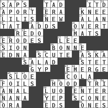 ACROSS 1. Plant excrements 5. Small boy 8. It would 11. To the left, to Queeg 13. Period 14. Leg joint 15. Ms. Damita and namesakes 16. ___ Haven, CT 17. Actor Alda or Thicke 18. Make lace 19. Does sums 21. Unconcealed 22. Do over again 24. Floor coverings 25. Eats (away) 27. Area sheltered from the wind 29. The Jewish people; Israel 30. Child's nurse 32. Pulitzer Prize-winning author Ferber 33. Scutum 35. "____ silly question..." 39. First course 41. Proofreading order 42. Con 43. Develop 45. _ gin 48. Root beer relative 49. Fencing necessities 50. Parka part 52. Three (prefix) 55. Of or related to the anus 56. Nilotic language 57. Keyboard key 59. Nanny 60. Slangy assent 61. Biscuitlike quick bread 62. Mouth or opening 63. Begley and Asner 64. Singles DOWN 1. Table seasoning 2. Capital of Western Samoa 3. Coward 4. _ Lanka 5. Look after 6. Ancient Greek god of war 7. Obsolete 8. An arm off of a larger body of water 9. Separates forcefully 10. Gouge 12. Sadhe (variant) 14. Polynesian shrub of the pepper family 20. Two (Sp.) 21. Sign of something about to happen 23. Ferber et al. 25. Compass dir. 26. To free from 27. Car dealer's back yard 28. Compass dir. 30. Partially opened flower 31. Artist's stand 33. Playfully artful 34. Head covering 36. Ski resort town in Vermont 37. Cask 38. Had dinner 40. Grows older 43. Environmental prefix 44. Methods 45. Underwater navigation system 46. Climbing, woody, usually tropical vines 47. Water jar 49. Papal veil 50. Took on color 51. I made a mistake 53. French philosopher Descartes 54. Angers 56. Potassium hydroxide 58. Non-commissioned officer (abbr.)