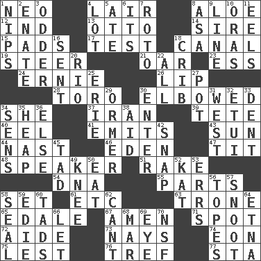 ACROSS 1. Modern: prefix 4. Den 8. _ vera 12. Working for oneself (abbr.) 13. "Beetle Bailey" pooch 14. Beget 15. Groovy apts. 17. Trial 18. Lessep's creation 19. Navigate 21. Rowing implement 23. Double-curved letter 24. Bert's buddy 26. Mouth edge 28. "Corrida" creature 30. Shoved, as through a crowd 34. A female animal or person 37. SW Asia republic 39. Wig 40. Snakelike fish 41. Gives off 43. Player for Phoenix 44. Political cartoonist Thomas 46. Locale of original sin 47. Teat (slang) 48. Orator 51. Libertine 54. Heredity factor (abbr.) 55. Pieces 58. Arrange properly for use 61. And so on (abbr.) 63. Heavy duty weighing machine 65. Peak District village in England 67. So be it 71. Specific locale 72. Helper 73. Negative votes 74. A really long time 75. For fear that 76. Not kosher 77. R.R. building DOWN 1. Cuts off 2. Maternal 3. More peculiar 4. Car dealer's back yard 5. Had dinner 6. It is 7. Printing process, for short 8. White ___ sheet 9. Actor's bit 10. Mouths or openings 11. Snakelike fish 16. Transmitted 18. Baby bed with high sides 20. _ de Janeiro 22. 100% 25. One of the Great Lakes 27. Cooking vessel 29. Channel Islands abalone 30. Keyboard key 31. Compass direction 32. Needle case 33. Undesirable depression on a surface 34. Elected reps. 35. Pile 36. Otherwise 38. Help 42. Fastener 45. Small boy 49. Leg joint 50. Erode 52. Krazy ___ of comics 53. Blunders 56. Drinks excessively 57. Snout, nose 58. Lick closed 59. Singer Brickell 60. Bits 62. Patter 64. Inactive volcano in Sicily 66. Allow 68. Third mo. 69. Sight organ 70. Science/research agcy.