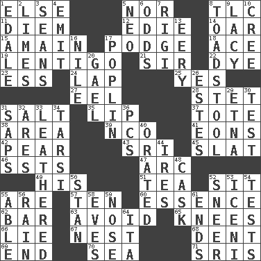 ACROSS 1. Otherwise 5. And not 8. Affectionate concern, for short 11. South Vietnam president (1954) 12. Singer Brickell 14. Rowing implement 15. At full speed 17. Porridge 18. Adept person 19. Small, flat, pigmented spot on the skin 21. Title for a knight 22. Color 23. Curvy letter 24. Infant locale 25. Consenting reply 27. Snakelike fish 28. Proofreading order 31. Table seasoning 35. Mouth edge 37. Lug 38. Type of rug 39. Non-commissioned officer (abbr.) 41. Immeasurably long periods of time 42. Lightbulb-shaped fruit 43. _ Lanka 45. Narrow board 46. Fast planes 47. Curve 49. Part of HMS, perhaps 51. Beverage made from leaves 52. Be seated 55. "We ___ not amused" (Victoria) 57. Nine, plus one 60. Gist 62. Oblong piece of solid material 63. Stay clear from 65. Leg joints 66. Whopper 67. A home for chicks 68. Undesirable depression on a surface 69. Conclusion 70. Ocean 71. Indian titles of respect DOWN 1. Peak District village in England 2. Citrus fruits 3. Seines 4. Give off 5. Modern: prefix 6. Probability 7. Swiss mountan, "Queen of the Mountains" 8. Inedible or poisonous agaric 9. Made of lace 10. Algonquian 13. Suggestive of the supernatural 16. The longest river in the world 17. Cotton for raincoats, e.g. 20. Highlander 26. _____ Park, CO 29. Inactive volcano in Sicily 30. Trial 31. Plant excrements 32. Ancient Greek god of war 33. Tough but pliablecoriaceous 34. Tarsus (plural) 36. Personal Computers (abbr.) 40. Spoke pompously 44. Angers 48. Keg 50. Comedian Laurel of Laurel & Hardy 52. Contemptuous expression 53. Ancient Celtic tribe of eastern Britain 54. Trials 55. Competent 56. Water falling in drops from the sky 58. Nights before holidays 59. Characteristic smell of wine 61. Extremities 64. Call ___ day
