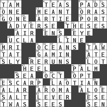 ACROSS 1. Scottish cap 4. Beverages made from leaves 8. Groovy apts. 12. Single 13. Intended 14. Mouths or openings 15. Went 17. Nick name for Arthur 18. Sweet dark-red dessert wine 19. Contrary to your interests or welfare 21. College papers 23. Atmosphere 24. Followers of ems 26. Sight organ 27. Southern CA. univ. 28. Actor's bit 30. Medical imaging device (abbr.) 31. Seas 34. The 23rd letter of the Hebrew alphabet 37. Make lace 38. Homeless child 39. Had dinner 40. Roguish 41. Summer TV shows 42. Car dealer's back yard 43. Person who is morally reprehensible 44. Inside of hand 46. Ocean 47. Sep. follower 50. Choose 51. Fortification 54. Of or relating to Laos or its people 57. Having or resembling wings 58. Odor 60. Medicinal plant 62. Table seasoning 63. Prying instrument 64. Compass dir. 65. It was, poetically 66. Perceives with the eye 67. Elected rep. DOWN 1. Coat; cloak 2. Small Philippine buffalo 3. Ananias' fault 4. Laconic 5. Ingested 6. Cuckoo 7. Proofreading order 8. Wimpy's pal 9. Came up 10. Have the gumption 11. Fast planes 13. Spoil 16. Tending to cause great harm 20. Epoch 22. Coop moms 25. Killed 27. Mountain range 29. Lodging establishments 30. Mountains (abbr.) 31. Double curve, resembling the letter S 32. Monte _, Las Vegas Hotel/Casino 33. Australian flightless bird 34. Baron Munchausen's specialties 35. Smallest unit of an element 36. Soggy 41. Tail end 43. Centers 44. Cooking vessel 45. Capital of Western Samoa 46. Any of the three canals of the cochlea 48. Garlic unit 49. Makes less strong or intense 51. Compass direction 52. Cole _ (cabbage dish) 53. Friends 55. Rowing implement 56. Olfactory organ 59. To sift 61. Car or cant ending