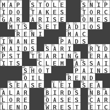 ACROSS 1. Atlas unit 4. Took without asking 9. Sever or remove by pinching or nipping 13. Wedding promise 14. Proceeds 15. Torque (variant) 16. Slender fish 17. Get up 18. Singles 19. Mountains (abbr.) 21. Put into a specified state 22. Goodbye (Sp.) 24. Painter Guido (1575-1642) 26. Big _ 27. Empty; void 29. Groovy apts. 30. Women servants 31. Indian skirt 33. To free from 36. Pacific Standard Time (abbr.) 37. Pulling apart 40. Period 41. It is 42. Clement's nick name 43. Slender Brazilian palm 45. Attempt 47. Aches 48. Petroleum 49. Tear apart 50. Gospel singer Marvin 52. Luau accessory 54. Ocean 56. Having or resembling wings 57. Avian creatures 59. Basketball assoc. 61. Old wives' tales, e.g. 62. Fertile tracts in a desert 63. 4-wheeled motor vehicle 64. Grant temporary use of 65. Obtain by seizing forcibly or violently 66. And so on (abbr.) DOWN 1. Russian fighter aircraft 2. First of billions? 3. Likenesses of persons 4. R.R. building 5. Tarsus (plural) 6. Migrant worker of the '30s 7. For fear that 8. Compass dir. 9. Unemotional ones 10. Words to Nanette 11. Angers 12. Personal Computers (abbr.) 20. Transmit 22. With great haste 23. Male parent 25. A home for chicks 27. Body of Kaffir warriors 28. Political cartoonist Thomas 29. Demure 31. Table seasoning 32. "We ___ not amused" (Victoria) 33. Dwelling 34. SW Asia republic 35. Raised platform 38. Learning spot: Fr. 39. Yawn 44. Without 45. Flew 46. Part of HMS, perhaps 49. Amusement-park features 50. _ gin 51. Merit 52. One who doesn't tell the truth 53. Celtic language 55. Blind as ____ 56. Everything 57. Arrow shooter 58. Fast jet (abbr.) 60. Curve