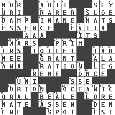 ACROSS 1. Not either 4. "This won't hurt ____!" 8. Insidious 11. RI univ. 12. Less widely known 14. A type of plum 15. Moist 17. Lacking in sense or substance 18. Floor coverings 19. Core 21. Webber/Rice musical 23. Auto club (abbr.) 24. ___ a Wonderful Life 25. Armed conflicts 27. Demure 30. Big collection agency 31. Bathroom plumbing fixture 34. Keyboard key 37. Born 38. Let have 39. In the manner of 40. Santa ___, CA 41. Food allowance for one day 43. Part of a journey 44. French philosopher Descartes 45. At one time in the past 47. University (slang) 49. Compass dir. 50. Greek mythologigal hunter 52. Pertaining to the sea 56. Spoken 57. Memphis, Tenn. Street 60. Old wives' tales, e.g. 61. Nathan's nickname 62. NE Netherlands city 63. Lair 64. Compass dir. 65. Blemish 66. Eastern Standard Time (abbr.) DOWN 1. Naked 2. Mouths or openings 3. Basketball hoops 4. N. Chile seaport 5. Object of repulsion 6. Retirement account (abbr.) 7. Nine, plus one 8. Narrow boards 9. Globular water bottle used in Asia 10. Consenting reply 13. To separate or throw off 14. Stricken, poetically 16. Lightbulb-shaped fruit 20. Political cartoonist Thomas 22. Zeal 25. Songbird 26. At sea 27. Food holder 28. Painter Guido (1575-1642) 29. "Tell ____ the Marines!" 30. _ tizzy (2 wds.) 32. Legendary monster 33. SW Asia republic 34. Baby powder 35. Toward shelter 36. Paper or plastic container 42. Characteristic smell of wine 44. _ de Janeiro 46. Anneal 47. A salt of uric acid 48. "Death on the ____" 49. Odor 50. Northwest Algerian city 51. Basketball assoc. 52. Butter sub 53. Connecting point 54. Angers 55. Penny 56. Single 58. Double-curved letter 59. Viper