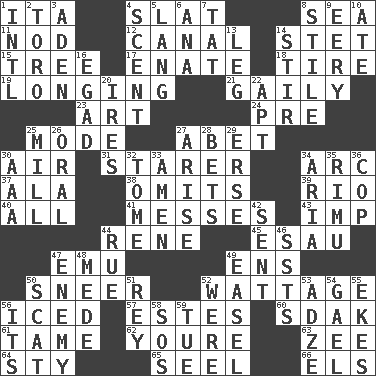 ACROSS 1. Call ___ day 4. Narrow board 8. Ocean 11. Dreamland 12. Lessep's creation 14. Proofreading order 15. Relationship diagram 17. Maternal 18. Hoop that covers a wheel 19. Yearning 21. Lightheartedly 23. Tate display 24. Before (prefix) 25. Method 27. Collude with 30. Wind 31. A viewer who gazes fixedly 34. Curve 37. Insect wing 38. Leaves out 39. River (Sp.) 40. Everything 41. Makes clutter 43. Naughty child 44. French philosopher Descartes 45. Son of Isaac 47. Australian flightless bird 49. Followers of ems 50. Contemptuous expression 52. Electrical Measurement 56. On the rocks 57. _____ Park, CO 60. Neighbor of Neb. 61. Not wild 62. You are 63. Last letter of the English alphabet 64. Filthy place 65. Sew up the eyelids of hawks and falcons 66. Raised railways DOWN 1. International (abbr.) 2. "Corrida" creature 3. Arabian gulf 4. Aroma 5. Austrian-born American filmmaker Fritz 6. Santa ___, CA 7. Make lace 8. Vertical member of a panel or frame 9. Suggestive of the supernatural 10. Had dinner 13. Part of a journey 14. Use a spoon 16. Mild oath 20. Angers 22. Fitting 25. Place where flour is made 26. Taken by mouth 27. Get up 28. Antes 29. Celtic language 30. Auto club (abbr.) 32. Heavy book 33. So be it 34. Roberta Peters solo 35. Tall New Zealand timber tree 36. Police officer (slang) 42. Emitted 44. Sorrow 46. Fast planes 47. Foe 48. Ancient Persian 49. Artist's stand 50. Leave at once 51. Marina Del _, California 52. Past tense of be (plural) 53. Edge tool used to cut and shape wood 54. Highlander 55. Makes supply last 56. It is 58. Distress signal 59. Third day of the wk.