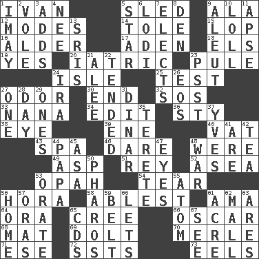 ACROSS 1. "Terrible" tsar 5. Downhill vehicle 9. Chicken ___ king 12. Methods 14. Lacquered or enameled metalware 15. Trim (branches) 16. Tree or shrub in the Birch family 17. Arabian gulf 18. Raised railways 19. It is so 20. Of or pertaining to medicine 23. Whimper 24. Small island 25. Trial 27. Scent 30. Conclusion 32. Distress signal 33. Nanny 34. Prepare for publication 36. Filthy place 38. Sight organ 39. Compass dir. 40. Large container 43. Health resort 46. Have the gumption 48. We are 49. Cleo's killer 51. Marina Del _, California 52. At sea 53. Brightly colored fish 54. Rend 56. Israeli folk dance 58. Most capable 61. Housemaid (var.) 64. Mouth or opening 65. Algonquian 66. Witty Wilde 68. Floor covering 69. Dunce 70. Haggard of country music 71. Compass dir. 72. Fast planes 73. Snakelike fish DOWN 1. "If ____ say so..." 2. Grand slam 3. Sums up 4. Born 5. Play the lead 6. Farming town in central California 7. Opts 8. Lair 9. Native American of Southwest Alaska 10. Hang loosely or laxly 11. Domed church section 13. Indian titles of respect 21. Toward shelter 22. Watched over 23. Inconspicuous attention getter 24. Retirement account (abbr.) 26. Greek goddess of the dawn 27. Single 28. 24 hours 29. Singles 31. Middle Eastern gold or silver currency 35. Cylindrical with tapered ends 37. Jacques Cousteau's middle name 41. "We ___ not amused" (Victoria) 42. Afternoon social gathering 44. Dad 45. White ___ sheet 47. Snake ____ (dice throw) 48. Armed conflict 50. N Egypt peninsula 53. Speak pompously 55. Tiny particle 56. Residence 57. Mouths or openings 59. Waist strap 60. Allows 61. Land measure 62. Promenade 63. Ancient Greek god of war 65. Music discs 67. Observe