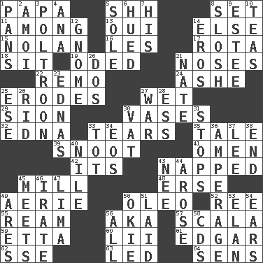 ACROSS 1. Dad 5. Quiet! 8. Arrange properly for use 11. Amid 13. Fr. "Yes" 14. Otherwise 15. Pitcher Ryan 16. French article 17. Round or rotation of duties 18. Be seated 19. Wrote a lyric poem 21. Olfactory organs 22. San ____ (Riviera town) 24. American tennis player Robert 25. Eats (away) 27. Dripping 29. The Jewish people; Israel 30. Flower holders 32. Pulitzer Prize-winning author Ferber 33. Pulls apart 35. Falsehood 39. Snout, nose 41. Sign of something about to happen 42. It is 43. Slept 45. Place where flour is made 48. Celtic language 49. Nest on high 50. Butter sub 52. To riddle 55. 480, 500 or 516 sheets of paper 56. Alias (abbr.) 57. Any of the three canals of the cochlea 59. Singer James 60. Cards in a Roman deck? 61. _ Allan Poe 62. Compass dir. 63. Directed 64. Elected reps. DOWN 1. Zero-star reviews 2. Mine, in Marseilles 3. Coward 4. Santa ___, CA 5. Flatfish 6. Became colored 7. Part of HMS, perhaps 8. Make a splashing sound 9. First name in cosmetics 10. Beverages made from leaves 12. Dwarf 14. Greek god of love 20. Two (Sp.) 21. Nathan's nickname 23. Ferber et al. 25. Compass dir. 26. To free from 27. Armed conflict 28. Curvy letter 30. Large container 31. Closes up, plugs up 33. Small child 34. Greek goddess of the dawn 36. Electrical Measurement 37. Area sheltered from the wind 38. Conclude 40. The longest river in the world 43. Born 44. Came up 45. Confronts 46. Feeling or showing extreme anger 47. Pale green bean 49. Ancient Greek god of war 50. Migrant worker of the '30s 51. Put down 53. Flair 54. Hearing organs 56. 100% 58. Music discs