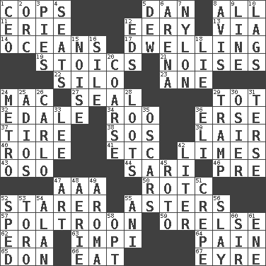 ACROSS 1. 911 reaches them 5. One of the 12 tribes of Israel 8. Everything 11. 4th largest of the Great Lakes 12. Suggestive of the supernatural 13. By way of 14. Seas 17. Home 19. Unemotional ones 21. Annoying sounds 22. Grain storage tower 23. One (Scot) 24. Big _ 27. Lick closed 29. Small child 32. Peak District village in England 34. Friend of Pooh 36. Celtic language 37. Hoop that covers a wheel 38. Distress signal 39. Den 40. Hero or heavy, e.g. 41. And so on (abbr.) 42. Citrus fruits 43. Bear (Spanish) 44. Indian skirt 46. Before (prefix) 47. American Automobile Association (abbr.) 50. College mil. group 52. A viewer who gazes fixedly 55. Michaelmas daisies 57. Coward 59. Threatening words 62. Epoch 63. Body of Kaffir warriors 64. Ache 65. Spanish title 66. Ingest 67. Jane of fiction DOWN 1. Corporate head (abbr.) 2. The grampus (Milton) 3. Sliced desserts 4. Theater features 5. Morning condensation 6. Sports stadium 7. Thermoplastic polyamide 8. Deliberation 9. Actor's bit 10. Falls behind 12. Begley and Asner 15. Annoying sound 16. Drop; flow; fall 18. Falsehood 20. Unrefined 24. Paris' subway 25. Goodbye (Sp.) 26. Monte _, Las Vegas Hotel/Casino 28. Plunders 29. _____ steamer (cargo ship) 30. Flexible twig of a willow tree 31. Laconic 33. Area sheltered from the wind 35. Motion picture awards 36. Biblical high priest 42. 61 cubic inches 45. Printing process, for short 47. Nonscientific branch of learning 48. Nest on high 49. Odor 51. Streamer paper 52. Moved rapidly 53. "Corrida" creature 54. Actor Alda or Thicke 55. Cuckoo 56. Kill 58. Choose 60. Title for a knight 61. Compass dir.