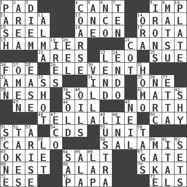 ACROSS 1. Writing tablet 4. Patter 8. Naughty child 11. Operatic vocal solo 13. At one time in the past 14. Relating to the mouth 15. Stitch closed the eyes of (a falcon) 16. A really long time 17. Roll call or roster of names 18. More given to overacting 21. 2nd pers. sing. pres. of can (arch.) 22. Ancient Greek god of war 23. Lion 25. Take to court 26. Enemy 29. Veterans Day date 32. Collect or gather 34. Working for oneself (abbr.) 35. Single 38. Soft 39. Twentieth part of a lira 41. Floor coverings 43. Modern: prefix 44. Lubricate 45. 0 degrees 46. Copy Pinocchio 50. Island 51. R.R. building 54. Music discs 55. A single undivided whole 57. Monte _, Las Vegas Hotel/Casino 59. Deli grouping 63. Migrant worker of the '30s 64. Table seasoning 67. Yard entry 68. Egg locale 69. Having or resembling wings 70. Three-handed card game 71. Compass dir. 72. Dad 73. Raised railways DOWN 1. Romantic infatuation 2. Type of rug 3. South Vietnam president (1954) 4. Unrefined 5. One (Scot) 6. Non-commissioned officer (abbr.) 7. "___ Little Indians" 8. Metal shackles 9. Taiwanese island in East China Sea 10. Food holder 12. _ mater 14. Mouth or opening 19. Angers 20. Snakelike fish 21. Small bed 23. Grant temporary use of 24. Inside; within (prefix) 26. Air blower 27. Presage 28. Relaxation 30. Country residence 31. Like (prefix) 33. Attempt 36. Drug cop 37. Singer James 39. Disposed of to a purchaser 40. Lubricates 42. Like a shrinking violet 45. Famous astronaut Armstrong 47. Environmental prefix 48. A period of five years 49. _ tizzy (2 wds.) 51. Biscuitlike quick bread 52. Proceeds 53. Get up 56. Labels 58. Allow 60. Cause to be 61. Slanted text style (abbr.) 62. Puts into a specified state 64. Plant excrement 65. In the manner of 66. Pet locale
