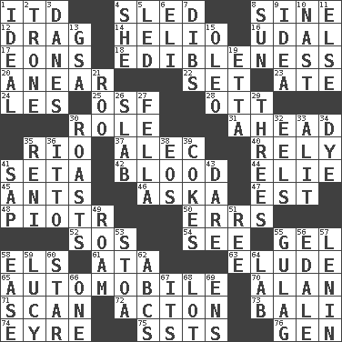 ACROSS 1. It would 4. Downhill vehicle 8. Trig term 12. To draw with force 14. Sun: prefix 16. Freehold land 17. Immeasurably long periods of time 18. The property of being fit to eat 20. Approach 22. Put into a specified state 23. Had dinner 24. French article 25. Order of Saint Francis (abbr.) 28. Baseball player Mel 30. Hero or heavy, e.g. 31. Toward the future 35. River (Sp.) 37. Actor Baldwin 40. Depend 41. Stalk of a moss capsule 42. Vital fluid 44. Writer Wiesel 45. Pismires 46. "____ silly question..." 47. Eastern Standard Time (abbr.) 48. Peter (Polish) 50. Blunders 52. Distress signal 54. Observe 55. Set 58. Raised railways 61. "One Day ___ Time" 63. Dodge 65. Form of transportation 70. Actor Alda or Thicke 71. Glance over 72. Gambison 73. Indonesian resort city 74. Jane of fiction 75. Fast planes 76. Commissioned mil. rank DOWN 1. Perfect 2. Heavy duty weighing machine 3. Natives or inhabitants of Denmark 4. A female animal or person 5. Directed 6. Connecticut Ivy Leaguer 7. Claim 8. Player for Phoenix 9. It may be bright or harebrained 10. Political cartoonist Thomas 11. Otherwise 13. Girls' org. (abbr.) 15. Margarine 19. Singer James 21. Friend of Pooh 26. Broad, flat, thick piece 27. Chap (slang) 29. Triads 30. Ridicules or criticizes harshly 32. Snakelike fish 33. Set down 34. Color 35. Painter Guido (1575-1642) 36. "Tell ____ the Marines!" 38. Greek goddess of the dawn 39. Popular sodas 41. Plant excrement 43. Have the gumption 49. Wander aimlessly 51. Portuguese money of account (variant) 53. Portico 55. POW camp 56. Peak District village in England 57. Soviet premier 1918-24 58. Relaxation 59. "I Love _" 60. Play the lead 62. Lettered men learn these first 64. Experiment locale 66. Single 67. It is 68. Car dealer's back yard 69. Followers of ems