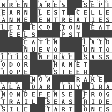 ACROSS 1. Songbird 5. Ancient Greek god of war 9. Back-to-school mo. 13. Merit 14. For fear that 15. Cell (Danish) 16. Queen of England 1702-14 17. Pleas 19. Luau accessory 20. Environmental prefix 21. Electrically charged atom 22. Ingest 23. Snakelike fish 25. Pacific Standard Time (abbr.) 26. Ingested 30. Put down 34. New (sp.) 35. To (old English) 36. _ and Stitch 39. Effrontery 42. Backtalk 43. Aroma 44. French painter Edouard 46. Drink excessively 47. Navigate 48. Immediately 51. Libertine 54. Wing 57. Rowing implement 58. Attempt 60. Retirement account (abbr.) 62. Unrelated to defense, as in spending 65. Tree-dwelling hopper 66. Lag or linger behind 67. Oceans 68. Travel on or in a vehicle 69. Drop; flow; fall 70. Small pie 71. Singles DOWN 1. Welt 2. Indian princess (variant) 3. Bert's buddy 4. Compass dir. 5. Actor Baldwin 6. Western Nevada city 7. Eastern Standard Time (abbr.) 8. Empty completely 9. Put into a specified state 10. Writer Wiesel 11. Entreaty 12. Trial 15. Patter 18. Greek goddess of the dawn 20. Son of Isaac 24. Poe poem 27. Nine, plus one 28. First lady 29. Typical standards 30. A period of five years 31. Santa ___, CA 32. ___ a Wonderful Life 33. Two (Sp.) 36. Car dealer's back yard 37. Wedding promise 38. Trim (branches) 40. Large container 41. Compass dir. 45. Suggestive of the supernatural 48. Christmas carol 49. Clumsy lout 50. Obtain by seizing forcibly or violently 52. Japanese brewing company 53. Eat (away) 54. Pismires 55. Australian parrot (variant) 56. Of or related to the anus 58. Russian ruler of old 59. Relief 61. Matures 63. Pass on 64. Teachers' org. 65. Away