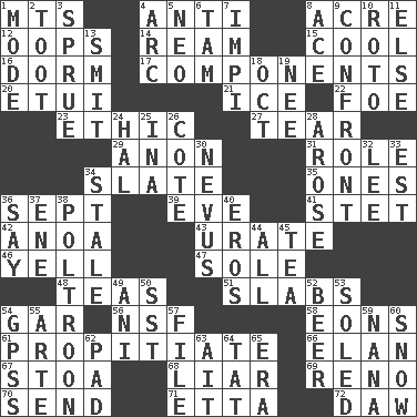 ACROSS 1. Mountains (abbr.) 4. Against 8. Measure of real estate 12. I made a mistake 14. 480, 500 or 516 sheets of paper 15. Calm and collected 16. Dormintory (informal) 17. Parts 20. Needle case 21. Frozen water 22. Enemy 23. Moral principle 27. Rend 29. Soon (poet.) 31. Hero or heavy, e.g. 34. Schedule 35. Washington bills 36. Back-to-school mo. 39. Night before a holiday 41. Proofreading order 42. Small Philippine buffalo 43. A salt of uric acid 46. Shout 47. Not divided or shared with others 48. Afternoon social gatherings 51. Broad, flat, thick pieces 54. Slender fish 56. Science/research agcy. 58. Immeasurably long periods of time 61. Conciliate 66. Enthusiasm 67. Portico 68. One who doesn't tell the truth 69. Former U.S. Attorney General Janet 70. Post 71. Singer James 72. Obsolete DOWN 1. Method 2. A blast of a horn 3. Disorder 4. Curve 5. Modern: prefix 6. Scottish cap 7. Body of Kaffir warriors 8. Adept person 9. Meet 10. Printing process, for short 11. Otherwise 13. Stricken, poetically 18. Sep. follower 19. Born 24. Actor Linden 25. _ tizzy (2 wds.) 26. ____ d'Azur (French Riviera) 28. Came up 30. Congenital growth or mark on the skin 32. Area sheltered from the wind 33. Eastern Standard Time (abbr.) 34. Having lost freshness 36. Declare 37. Compass dir. 38. Coward 40. Greek god of love 44. Everything 45. Afternoon social gathering 49. Cuckoo 50. Fast jet (abbr.) 52. Fermented drink made from hops 53. Having a sole or soles 54. Global Positioning Systems (abbr.) 55. Johnson of "Laugh-In" 57. Do some clerical work 59. Grandmother 60. Overwhelm 62. Writing tablet 63. Small island 64. Make lace 65. Period
