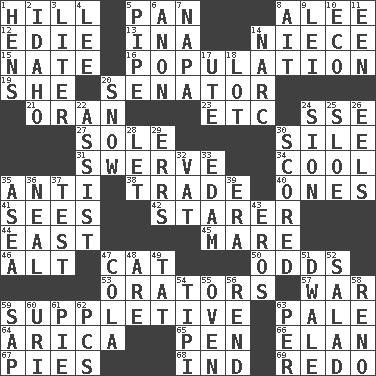 ACROSS 1. Land elevation 5. Baking dish 8. Toward shelter 12. Singer Brickell 13. _ tizzy (2 wds.) 14. Sibling's daughter 15. Nathan's nickname 16. Census information 19. A female animal or person 20. Legislator 21. NW Algerian seaport 23. And so on (abbr.) 24. Compass dir. 27. Not divided or shared with others 30. Drop; flow; fall 31. Turn aside suddenly 34. Calm and collected 35. Against 38. Barter 40. Washington bills 41. Observes 42. A viewer who gazes fixedly 44. Compass direction 45. Female horse 46. Keyboard modifier key 47. Domesticated feline 50. Probability 53. Speakers 57. Armed conflict 59. Supplementary 63. Light colored 64. N. Chile seaport 65. Fenced enclosure 66. Enthusiasm 67. Sliced desserts 68. Working for oneself (abbr.) 69. Make new DOWN 1. Coop moms 2. Potato state 3. 61 cubic inches 4. Area sheltered from the wind 5. Corncob 6. Soon (poet.) 7. California wine valley 8. Small island 9. Flowery wreath 10. Environmental prefix 11. Car or cant ending 14. Drug cop 17. Shoshoni 18. Car dealer's back yard 20. Frozen precipitation 22. Aid 24. The Jewish people; Israel 25. _ gin 26. Snakelike fish 28. Allow 29. Blunders 30. Tallied 32. Large container 33. Dutch treat 35. Toward the sea 36. Be tempered by heat 37. Trial 39. Epoch 43. Greek god of love 47. Root beer relative 48. "We ___ not amused" (Victoria) 49. Make lace 51. A sleeping potion; an opiate (poet.) 52. First course 54. Native american tent (variation) 55. Baking chamber 56. Tear apart 58. Western Nevada city 59. Plant excrement 60. RI univ. 61. Sliced dessert 62. Personal Computers (abbr.) 63. For each